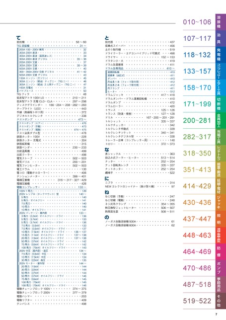 溶接機治具発電機コンプレッサーエアー工具切断機金属加工充電工具レンチ・トルク揚重・搬送延線・電材ジャッキ照明清掃・集塵・換気防爆ポンプ季節用品その他7010〜106107〜117118〜132133〜157158〜170171〜199200〜281282〜317318〜350351〜413414〜429430〜436437〜447448〜463464〜469470〜486487〜518519〜522光器・・・・・・・・・・・・・・・・・・・・・437搭乗式スイーパー・・・・・・・・・・・・・・・・456土のう制作機・・・・・・・・・・・・・・・・・・519ドライクーラー・エアコンハイブリッド可搬式・・・498ドライヤー・・・・・・・・・・・・・・・152〜153ドラタン小・大・・・・・・・・・・・・・・・・・419ドラム缶運搬車・・・・・・・・・・・・・・・・・411ドラム缶専用品・・・・・・・・・・・・・・・410〜運搬回転機・・・・・・・・・・・・・・・・・・・・・410運搬車(油圧式)・・・・・・・・・・・・・・・・・・・411ダンパー・・・・・・・・・・・・・・・・・・・・・・410吊金具1本(フォーク取付用)・・・・・・・・・・・・・412吊金具2本(フォーク取付用)・・・・・・・・・・・・・412吊クランプ・・・・・・・・・・・・・・・・・・・・・411ヒーター・・・・・・・・・・・・・・・・・・・・・・512ドラムジャッキ・・・・・・・・・・・・・417〜418ドラムダンパー・ドラム運搬回転機・・・・・・・・410ドラムポンプ・・・・・・・・・・・・・・・・・・472ドラムローラー・・・・・・・・・・・・・・・・・420125〜126トランス・・・・・・・・・・・・・・・・トランス(防滴・複巻)・・・・・・・・・・127〜128167・200〜201・291ドリル・・・・・・・・・・・トルシャット・・・・・・・・・・・・・・335〜337トルクチェッカー・・・・・・・・・・・・・・・・342トルクレンチ手動式・・・・・・・・・・・・・・・339トルクレンチソケット・・・・・・・・・・340〜341トルクレンチデジタル型・・・・・・・・・・・・・338トレーラー台車(コンプレッサー用)・・・・・・・・148トロリー・・・・・・・・・・・・・・・・372〜373と投シャックル・・・・・・・・・・・・・・・・・・363513〜514投込み式クーラー・ヒーター・・・・・・・252〜254ナッター・・・・・・・・・・・・・・・・335〜337ナット回転角レンチ・・・・・・・・・・・ナットカッター・・・・・・・・・・・・・252〜254縄梯子・・・・・・・・・・・・・・・・・・・・・522な長ブラ・・・・・・・・・・・・・・・・・・・・・31497NEWエレクトロシャイナー(焼け取り機)・・・・・にニじ切器(手動)・・・・・・・・・・・・・・・・・247ねじ切機(電動)・・・・・・・・・・・・・・・・・248ネジ式吊クランプ・・・・・・・・・・・・354〜355506〜507熱交換型ジェットヒーター・・・・・・・・熱風発生器・・・・・・・・・・・・・・・508〜511ねね6162ーガス自動溶接機500A・・・・・・・・・・・・・ノーガス自動溶接機600A・・・・・・・・・・・・・のノ抗機・・・・・・・・・・・・・・・・・・58〜60・・・・・・・・・・・・・・・・・・31〜TIG溶接機32200A100・200V兼用・・・・・・・・・・・・・・・・33300A200V直流・・・・・・・・・・・・・・・・・・・34300A200V直流(高周波レス)・・・・・・・・・・・・35〜36300A200V直流デジタル・・・・・・・・・・・37200A200V交直・・・・・・・・・・・・・・・・・・・38〜39300A200V交直・・・・・・・・・・・・・・・・40500A200V交直・・・・・・・・・・・・・・・・・・・41〜42300・350A200V交直デジタル43500A200V交直デジタル・・・・・・・・・・・・・・45150Aエンジン(ガソリン)・・・・・・・・・・・・・・46300Aエンジン(軽油)ティグニー(TIGニー)・・・・・47300Aエンジン(軽油)2人用ティグニー(TIGニー)・・31160A充電式・・・・・・・・・・・・・・・・・・・・50パイプエース・・・・・・・・・・・・・・・・・・・・48TIGフィラ・・・・・・・・・・・・・・・・・・・210〜211低床型アトラ100VLO・・・・・・・・・・297〜298低床型アトラ充電CLO・CLA・・・・・・・ディスクグラインダー・166・204〜208・282〜283テープライト(LED)・・・・・・・・・・・・・・・443手鎖(高揚程トロリ用)・・・・・・・・・・・・・・372デジタルトルクレンチ・・・・・・・・・・・・・・338テストポンプ・・・・・・・・・・・・・・・・473〜テストポンプ(エアー)・・・・・・・・・・・・・・・・476テストポンプ(手動)・・・・・・・・・・・・・・・・・473テストポンプ(電動)・・・・・・・・・・・・・474〜475テスト治具ダブル型・・・・・・・・・・・・・・・478鉄筋カッター100V・・・・・・・・・・・・・・・228鉄筋カッター充電式・・・・・・・・・・・・・・・304鉄筋結束機・・・・・・・・・・・・・・・・・・・315鉄筋ベンダー・・・・・・・・・・・・・・230〜233出前温風機・・・・・・・・・・・・・・・・・・・499出前クーラー・・・・・・・・・・・・・