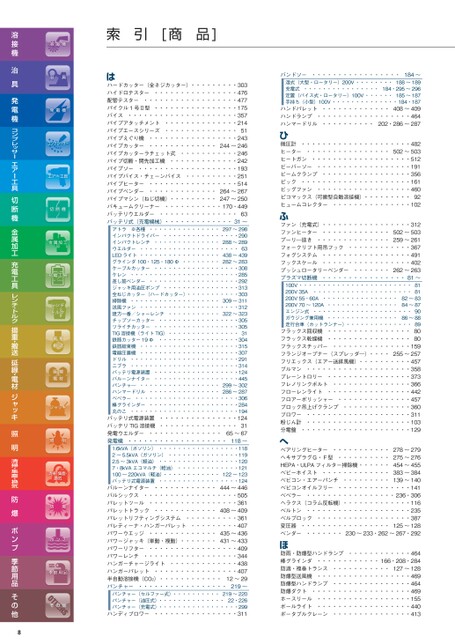 184〜バンドソー・・・・・・・・・・・・・・・・・188〜189湿式(大型・ロータリー)200V・・・・・・・・184・295〜296充電式・・・・・・・・・・・・・・・・定置(バイス式・ロータリー)100V・・・・・・185〜187手持ち(小型)100V・・・・・・・・・・・・・・184・187ハンドパレット・・・・・・・・・・・・・408〜409ハンドランプ・・・・・・・・・・・・・・・・・・464ハンマードリル・・・・・・・・・・202・286〜287圧計・・・・・・・・・・・・・・・・・・・・・482ヒーター・・・・・・・・・・・・・・・・502〜503ヒートガン・・・・・・・・・・・・・・・・・・・512ビーバーソー・・・・・・・・・・・・・・・・・・191ビームクランプ・・・・・・・・・・・・・・・・・356ピック・・・・・・・・・・・・・・・・・・・・・161ビッグファン・・・・・・・・・・・・・・・・・・460ピコマックス(可搬型自動溶接機)・・・・・・・・・92ヒュームコレクター・・・・・・・・・・・・・・・102ひ微ァン(充電式)・・・・・・・・・・・・・・・・・312502〜503ファンヒーター・・・・・・・・・・・・・プーリ―抜き・・・・・・・・・・・・・・259〜261フォークリフト用吊フック・・・・・・・・・・・・367フォグシステム・・・・・・・・・・・・・・・・・491フックスケール・・・・・・・・・・・・・・・・・402プッシュロータリーベンダー・・・・・・・262〜263プラズマ切断機・・・・・・・・・・・・・・・・81〜81100V・・・・・・・・・・・・・・・・・・・・・・・・200V35A・・・・・・・・・・・・・・・・・・・・・8182〜83200V55・60A・・・・・・・・・・・・・・・・84〜87200V70〜120A・・・・・・・・・・・・・・・90エンジン式・・・・・・・・・・・・・・・・・・・・・86〜88ガウジング兼用機・・・・・・・・・・・・・・・89走行台車(カットランナー)・・・・・・・・・・・・・・フラックス回収機・・・・・・・・・・・・・・・・80フラックス乾燥機・・・・・・・・・・・・・・・・80フラックスチッパー・・・・・・・・・・・・・・・159フランジオープナー(スプレッダ―)・・・・255〜257フリエックス(エアー送排風機)・・・・・・・・・・457ブルマン・・・・・・・・・・・・・・・・・・・・358プレーントロリー・・・・・・・・・・・・・・・・373フレノリンクボルト・・・・・・・・・・・・・・・366フローレンライト・・・・・・・・・・・・・・・・442フロアーポリッシャー・・・・・・・・・・・・・・457ブロック吊上げクランプ・・・・・・・・・・・・・360ブロワー・・・・・・・・・・・・・・・・・・・・311粉じん計・・・・・・・・・・・・・・・・・・・・103分電盤・・・・・・・・・・・・・・・・・・・・・129ふフ278〜279アリングヒーター・・・・・・・・・・・275〜276ヘキサプラグG・F型・・・・・・・・・・454〜455HEPA・ULPAフィルター掃除機・・・・・・383〜384ベビーホイスト・・・・・・・・・・・・・139〜140ベビコン・エアーパンチ・・・・・・・・・ベビコンオイルフリー・・・・・・・・・・・・・・141ベベラー・・・・・・・・・・・・・・・・・236・306ヘラクス(コラム反転機)・・・・・・・・・・・・・116ベルトン・・・・・・・・・・・・・・・・・・・・235ベルブロック・・・・・・・・・・・・・・・・・・387変圧器・・・・・・・・・・・・・・・・・125〜128230〜233・262〜267・292ベンダー・・・・・・・へベ雨・防爆型ハンドランプ・・・・・・・・・・・・464棒グラインダ・・・・・・・・・・・・166・208・284防滴・複巻トランス・・・・・・・・・・・127〜128防爆型送風機・・・・・・・・・・・・・・・・・・469防爆型ハンドランプ・・・・・・・・・・・・・・・464防爆ダクト・・・・・・・・・・・・・・・・・・・469ホースリール・・・・・・・・・・・・・・・・・・155ボールライト・・・・・・・・・・・・・・・・・・440ポータブルクレーン・・・・・・・・・・・・・・・413ほ防ードカッター(全ネジカッター)・・・・・・・・・303ハイドロテスター・・・・・・・・・・・・・・・・476配管テスター・・・・・・・・・・・・・・・・・・477パイクル1号Ⅱ型・・・・・・・・・・・・・・・・175バイス・・・・・・・・・・・・・・・・・・・・・357パイプアタッチメント・・・・・・・・・・・・・・214パイプエースシリーズ・・・・・・・・・・・・・・51パイプえぐり機・・・・・・・・・・・・・・・・・243パイプカッター・・・・・・・・・・・・・244〜246パイプカッターラチェット式・・・・・・・・・・・246パイプ切断・開先加工機・・・・・・・・・・・・・242パイプソー・・・・・・・・・・・・・・・・・・・193パイプバイス・チェーンバイス・・・・・・・・・・251パイプヒーター・・・・・・・・・・・・・・・・・514264〜267パイプベンダー・・・・・・・・・・・・・パイプマシ