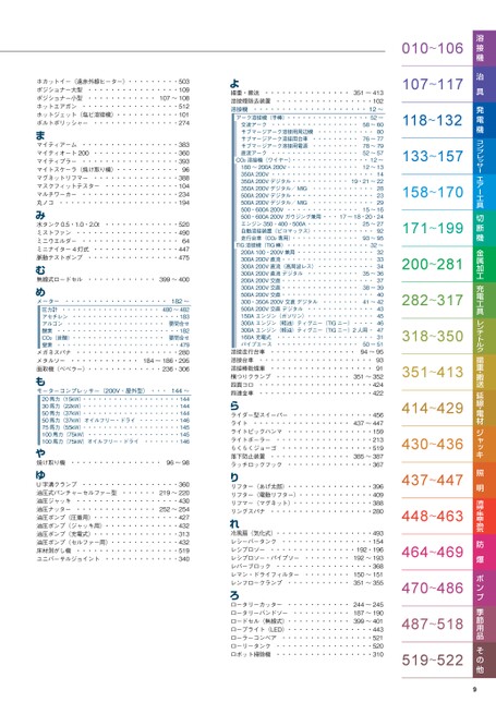 溶接機治具発電機コンプレッサーエアー工具切断機金属加工充電工具レンチ・トルク揚重・搬送延線・電材ジャッキ照明清掃・集塵・換気防爆ポンプ季節用品その他9010〜106107〜117118〜132133〜157158〜170171〜199200〜281282〜317318〜350351〜413414〜429430〜436437〜447448〜463464〜469470〜486487〜518519〜522重・搬送・・・・・・・・・・・・・・・351〜413溶接煙除去装置・・・・・・・・・・・・・・・・・102溶接機・・・・・・・・・・・・・・・・・・・・12〜アーク溶接機(手棒)・・・・・・・・・・・・・・・・52〜58〜60交流アーク・・・・・・・・・・・・・・・・・サブマージアーク溶接用周辺機・・・・・・・・・・・8076〜77サブマージアーク溶接用台車・・・・・・・・・78〜79サブマージアーク溶接用電源・・・・・・・・・直流アーク・・・・・・・・・・・・・・・・・52〜57CO2溶接機(ワイヤー)・・・・・・・・・・・・・・・12〜12〜13180〜200A200V・・・・・・・・・・・・・・350A200V・・・・・・・・・・・・・・・・・・・・1419・21〜22350A200Vデジタル・・・・・・・・・・・28350A200Vデジタル/MIG・・・・・・・・・・・・500A200Vデジタル・・・・・・・・・・・・・・・・23500A200Vデジタル/MIG29・・・・・・・・・・・・500・600A200V・・・・・・・・・・・・・・15〜16500・600A200Vガウジング兼用・・・17〜18・20・2425〜27エンジン350・400・500A・・・・・・・・・・自動溶接装置(ピコマックス)・・・・・・・・・・・・92走行台車(CO2専用)・・・・・・・・・・・・・93〜95TIG溶接機(TIG棒)・・・・・・・・・・・・・・・・32〜32200A100・200V兼用・・・・・・・・・・・・・・・33300A200V直流・・・・・・・・・・・・・・・・・・300A200V直流(高周波レス)・・・・・・・・・・・3435〜36300A200V直流デジタル・・・・・・・・・・200A200V交直・・・・・・・・・・・・・・・・・・3738〜39300A200V交直・・・・・・・・・・・・・・・500A200V交直・・・・・・・・・・・・・・・・・・4041〜42300・350A200V交直デジタル43500A200V交直デジタル・・・・・・・・・・・・・45150Aエンジン(ガソリン)・・・・・・・・・・・・・300Aエンジン(軽油)ティグニー(TIGニー)・・・・4647300Aエンジン(軽油)ティグニー(TIGニー)2人用・160A充電式・・・・・・・・・・・・・・・・・・・3150〜51パイプエース・・・・・・・・・・・・・・・・94〜95溶接走行台車・・・・・・・・・・・・・・・溶接台車・・・・・・・・・・・・・・・・・・・・93溶接棒乾燥庫・・・・・・・・・・・・・・・・・・91横つりクランプ・・・・・・・・・・・・・351〜352四面コロ・・・・・・・・・・・・・・・・・・・・424四連金車・・・・・・・・・・・・・・・・・・・・422よ揚・・・・・・・イダー型スイーパー・・・・・・・・・・・・・・456ライト・・・・・・・・・・・・・・・・・437〜447ライトピックハンマ・・・・・・・・・・・・・・・159ライトボーラー・・・・・・・・・・・・・・・・・213らくらくジョーゴ・・・・・・・・・・・・・・・・519落下防止装置・・・・・・・・・・・・・・385〜387ラッチロックフック・・・・・・・・・・・・・・・367らラフター(あげ太郎)・・・・・・・・・・・・・・・396リフター(電動リフター)・・・・・・・・・・・・・409リフマー(マグネット)・・・・・・・・・・・・・・388リングスパナ・・・・・・・・・・・・・・・・・・280りリ風扇(気化式)・・・・・・・・・・・・・・・・・493レシーバータンク・・・・・・・・・・・・・・・・154レシプロソー・・・・・・・・・・・・・・・192・196レシプロソー・パイプソー・・・・・・・・192〜193レバーブロック・・・・・・・・・・・・・・・・・368150〜151レマン・ドライフィルター・・・・・・・・レンフロークランプ・・・・・・・・・・・351〜355れ冷244〜245ータリーカッター・・・・・・・・・・・187〜190ロータリーバンドソー・・・・・・・・・・ロードセル(無線式)・・・・・・・・・・・399〜401ロープライト(LED)・・・・・・・・・・・・・・・443ローラーコンベア・・・・・・・・・・・・・・・・521ローリータンク・・・・・・・・・・・・・・・・・520ロボット掃除機・・・・・・・・・・・・・・・・・310ろロホカットイー(遠赤外線ヒーター)・・・・・・・・・503ポジショナー大型・・・・・・・・・・・・・・・・109ポジショナー小型・・・・・・・・・・・・107〜108ホットエアガン・・・・・・・・・・・・・・・・・512ホットジェット(塩ビ溶接機)・・・・・・・・・・・101ボルトポリッシャー・・・・・・・・・・・・・・・274イティアーム・・・・・・・・・・・・・・・・・383マイティオート200・・・・・・・・・・・・・・・360マイティプラー・・・・・・・・・・・・・・・・・393マイトスケーラ(焼け取り機)・・・・・・・・・・・96マグネットリフマー・・・・・・・・・・・・・・・388マスクフィットテスター・・・・・・・・