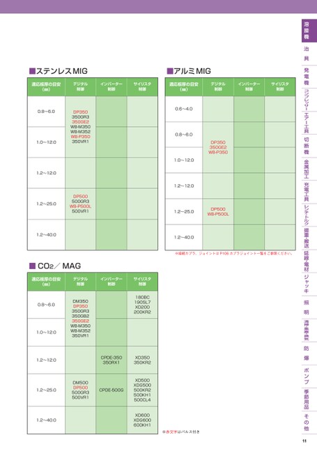 ■ステンレスMIG■アルミMIG適応板厚の目安(㎜)デジタル制御インバーター制御サイリスタ制御適応板厚の目安(㎜)デジタル制御インバーター制御サイリスタ制御DP350350GR3350GE2WB-M350WB-M352WB-P350350VR1DP500500GR3WB-P500L500VR10.8〜6.01.0〜12.01.2〜12.01.2〜25.01.2〜40.00.6〜4.00.8〜6.01.0〜12.01.2〜12.0DP350350GE2WB-P3501.2〜25.0DP500WB-P500L1.2〜40.0※接続カプラ、ジョイントはP106カプラジョイント一覧をご参照ください。■CO2/MAG適応板厚の目安(㎜)デジタル制御インバーター制御サイリスタ制御0.8〜6.01.0〜12.01.2〜12.01.2〜25.01.2〜40.0180BC190SL7XD200200KR2DM350DP350350GR3350GB2350GE2WB-M350WB-M352350VR1CPDE-350350RX1XD350350KR2DM500DP500500GR3500VR1CPDE-500GXD500XDG500500KR2500KH1500CL4XD600XDG600600KH1※赤文字はパルス付き11