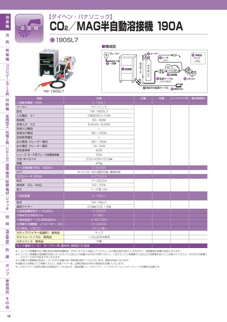 【ダイヘン・パナソニック】CO2/MAG半自動溶接機190A●190SL7■構成図YM-190SL7商品①溶接用電源190Aメーカー型式入力電圧※1周波数定格入力※2定格入力電流定格出力電流定格負荷電圧出力電流・クレーター電流出力電圧・クレーター電圧定格使用率ヒューズ、モータ用ブレーカ容量推奨値寸法:W×D×H質量②一次電源線8SQ4芯5m2CT③CO2トーチ200A型式使用率CO2/MAG長さ④送給装置日極月極セーフティサービス料基本管理料仕様S-19SL7パナソニックYM-190SL7三相200V±10%50/60㎐6.4kVA/6.2kWー60〜190Aー60〜190A16〜24V40%30A310×436×510㎜47㎏S-8C405※10・20・30m選択可能、価格別途S-YT20C4YT-20CS450/25%トーチ長:3mS-18AJ1YW-18AJ1S-CE2KRS-38E1S-WCT382S-CO2GNリモコン無しチップノズル200A専用不要(0.8㎜)0.9、1.2㎜型式適用ワイヤー⑤送給装置延長ケーブル20m⑥母材万力38SQ1m⑦母材延長ケーブル38SQ20m⑧炭酸ガス調整器ノーヒーター※3⑨190Aリモコン⑩チップ(ワイヤー径選択)販売品⑩ストレートノズル販売品⑩オリフィス販売品セット価格(①〜⑧)セーフティ料、基本料、消耗品(⑩)別途※1エンジン発電機の出力電圧設定は無負荷運転時、200〜210Vに設定してください。出力電圧設定を高くしすぎますと、溶接電源の故障の原因となります。※2エンジン発電機は溶接機の定格入力(kVA)の2倍以上の容量のものをご利用ください。1台のエンジン発電機で2台以上の溶接機を使うことは避けてください。それぞれの影響によりアーク切れが起きやすくなります。※3炭酸ガス調整器は別途ヒーター付きや流量の多い準耐風仕様ゲージもございます。電源は別途となります。※炭酸ガスは現地にてご用意ください。溶接ワイヤー他、必要な場合は早めの御相談をお願いいたします。※()内ワイヤーご使用の場合は消耗品チップと合わせ、送給装置フィードローラー、トーチライナーとインナーチューブの確認が必要です。12