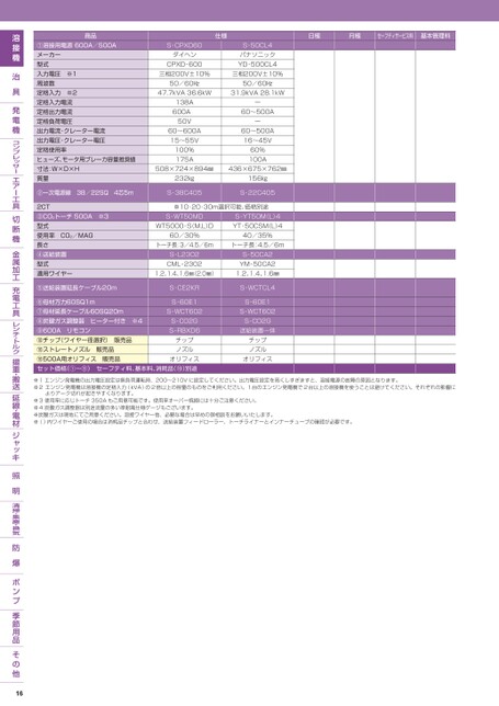 商品①溶接用電源600A/500Aメーカー型式入力電圧※1周波数定格入力※2定格入力電流定格出力電流定格負荷電圧出力電流・クレーター電流出力電圧・クレーター電圧定格使用率ヒューズ、モータ用ブレーカ容量推奨値寸法:W×D×H質量②一次電源線38/22SQ4芯5m2CT③CO2トーチ500A※3型式使用率CO2/MAG長さ④送給装置型式適用ワイヤー仕様日極月極セーフティサービス料基本管理料S-CPXD60ダイヘンCPXD-600S-50CL4パナソニックYD-500CL4三相200V±10%三相200V±10%50/60㎐50/60㎐47.7kVA36.6kW31.9kVA28.1kW138A600A50V60〜600A15〜55V100%175Aー60〜500Aー60〜500A16〜45V60%100A508×724×894㎜436×675×762㎜232㎏S-38C405156㎏S-22C405※10・20・30m選択可能、価格別途S-WT50MDWT5000-S(M,L)D60/30%S-YT50M(L)4YT-50CSM(L)440/35%トーチ長:3/4.5/6mトーチ長:4.5/6mS-L2302CML-2302S-50CA2YM-50CA21.2、1.4、1.6㎜(2.0㎜)1.2、1.4、1.6㎜⑤送給装置延長ケーブル20mS-CE2KRS-60E1S-WCT602⑥母材万力60SQ1m⑦母材延長ケーブル60SQ20m⑧炭酸ガス調整器ヒーター付き※4⑨600Aリモコン⑩チップ(ワイヤー径選択)販売品⑩ストレートノズル販売品⑩500A用オリフィス販売品オリフィスセット価格(①〜⑨)セーフティ料、基本料、消耗品(⑩)別途S-CO2GS-RBXD6チップノズルS-WCTCL4S-60E1S-WCT602S-CO2G送給装置一体チップノズルオリフィス※1エンジン発電機の出力電圧設定は無負荷運転時、200〜210Vに設定してください。出力電圧設定を高くしすぎますと、溶接電源の故障の原因となります。※2エンジン発電機は溶接機の定格入力(kVA)の2倍以上の容量のものをご利用ください。1台のエンジン発電機で2台以上の溶接機を使うことは避けてください。それぞれの影響によりアーク切れが起きやすくなります。※3使用率に応じトーチ350Aもご用意可能です。使用率オーバー焼損には十分ご注意ください。※4炭酸ガス調整器は別途流量の多い準耐風仕様ゲージもございます。※炭酸ガスは現地にてご用意ください。溶接ワイヤー他、必要な場合は早めの御相談をお願いいたします。※()内ワイヤーご使用の場合は消耗品チップと合わせ、送給装置フィードローラー、トーチライナーとインナーチューブの確認が必要です。16