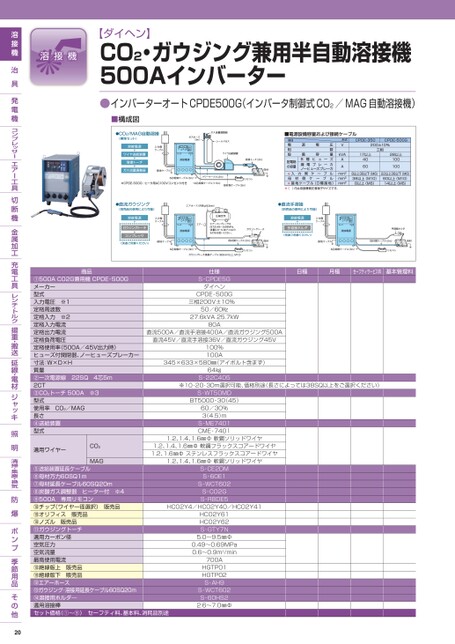 【ダイヘン】CO2・ガウジング兼用半自動溶接機500Aインバーター●インバーターオートCPDE500G(インバータ制御式CO2/MAG自動溶接機)■構成図日極月極セーフティサービス料基本管理料直流500A/直流手溶接400A/直流ガウジング500A直流45V/直流手溶接36V/直流ガウジング45V345×633×580㎜(アイボルト含まず)※10・20・30m選択可能、価格別途(長さによっては38SQ以上をご選択ください)商品①500ACO2G兼用機CPDE-500Gメーカー型式入力電圧※1定格周波数定格入力※2定格入力電流定格出力電流定格負荷電圧定格使用率(500A/45V出力時)ヒューズ付開閉器、ノーヒューズブレーカー寸法:W×D×H質量②一次電源線22SQ4芯5m2CT③CO2トーチ500A※3型式使用率CO2/MAG長さ④送給装置型式適用ワイヤーCO2仕様S-CPDE5GダイヘンCPDE-500G三相200V±10%50/60㎐27.6kVA25.7kW80A100%100A64㎏S-22C405S-WT50MDBT5000-30(45)60/30%3(4.5)mS-ME7401CME-74011.2、1.4、1.6㎜Φ軟鋼ソリッドワイヤ1.2、1.4、1.6㎜Φ軟鋼フラックスコアードワイヤ1.2、1.6㎜Φステンレスフラックスコアードワイヤ1.2、1.4、1.6㎜Φ軟鋼ソリッドワイヤHCO2Y4/HCO2Y40/HCO2Y41MAG⑤送給装置延長ケーブル⑥母材万力60SQ1m⑦母材延長ケーブル60SQ20m⑧炭酸ガス調整器ヒーター付※4⑨500A専用リモコン⑩チップ(ワイヤー径選択)販売品⑩オリフィス販売品⑩ノズル販売品⑪ガウジングトーチ適用カーボン径空気圧力空気流量最高使用電流⑩絶縁版上販売品⑩絶縁版下販売品⑫エアーホース⑬ガウジング・溶接用延長ケーブル60SQ20m⑭溶接用ホルダ―適用溶接棒セット価格(①〜⑨)セーフティ料、基本料、消耗品別途S-CE2DMS-60E1S-WCT602S-CO2GS-RBDE5HCO2Y61HCO2Y62S-GTY7N5.0〜9.5㎜Φ0.49〜0.69MPa0.6〜0.9m3/min700AHGTP01HGTP02S-AH9S-WCT602S-60HS22.6〜7.0㎜Φ20