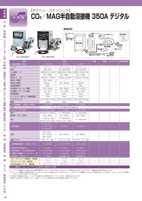【ダイヘン・パナソニック】CO2/MAG半自動溶接機350Aデジタル■構成図YD-350GR3YD-350VR1日極月極セーフティサービス料基本管理料S-DM350ダイヘンDM-350仕様S-35GR3パナソニックYD-350GR3S-35VR1パナソニックYD-350VR1三相200V±10%三相200V±10%三相200〜220V±10%50/60㎐50/60㎐50/60㎐18.5kVA15.0kW17.0kVA16.0kW16.4kVA15.0kW54/49A350A36V30〜350A12〜36V60%75Aー30〜350Aー30〜350A12〜36V60%60Aー350A36V30〜350A12〜36V60%60A250×560×370㎜380×540×640㎜380×540×640㎜28㎏S-14C40545㎏S-14C40548㎏S-14C405※10・20・30m選択可能、価格別途S-WT351S(M)WT3510-S(M)D60/30%S-YT35M4YT-35CSM445/35%トーチ長:3/4.5m※4.5mフレキタイプもありトーチ長:4.5m※4.5mフレキタイプもありS-YT35M4YT-35CSM445/35%トーチ長:4.5m商品①溶接用電源350Aメーカー型式入力電圧※1周波数定格入力※2定格入力電流定格出力電流定格負荷電圧出力電流・クレーター電流出力電圧・クレーター電圧定格使用率ヒューズ、モータ用ブレーカ容量推奨値寸法:W×D×H質量②一次電源線14SQ4芯5m2CT③CO2トーチ350A型式使用率CO2/MAG長さ④送給装置型式適用ワイヤー⑤送給装置延長ケーブル20/15mS-CE2DMS-38E1S-WCT382S-CO2GN⑥母材万力38SQ1m⑦母材延長ケーブル38SQ20m⑧炭酸ガス調整器ノーヒーター※3⑨350Aリモコン⑩チップ(ワイヤー径選択)販売品⑩ストレートノズル販売品⑩350A用オリフィス販売品セット価格(①〜⑨)セーフティ料、基本料、消耗品(⑩)別途S-RBDチップノズルオリフィスS-CM7401/S-CM7402/S-CM7403CM-7401/CM-7402/CM-74030.9、1.0、1.2㎜S-35DG1S-35DG1YW-35DG1YW-35DG10.9、1.0、1.2㎜0.8、0.9、1.0、1.2㎜S-CE15GRS-38E1S-WCT382S-CO2GN送給装置一体チップノズルオリフィスS-CE15GRS-38E1S-WCT382S-CO2GN送給装置一体チップノズルオリフィス※1エンジン発電機の出力電圧設定は無負荷運転時、200〜210Vに設定してください。出力電圧設定を高くしすぎますと、溶接電源の故障の原因となります。※2エンジン発電機は溶接機の定格入力(kVA)の2倍以上の容量のものをご利用ください。1台のエンジン発電機で2台以上の溶接機を使うことは避けてください。それぞれの影響によりアーク切れが起きやすくなります。※3炭酸ガス調整器は別途ヒーター付きや流量の多い準耐風仕様ゲージもございます。電源は別途となります。※炭酸ガスは現地にてご用意ください。溶接ワイヤー他、必要な場合は早めの御相談をお願いいたします。22