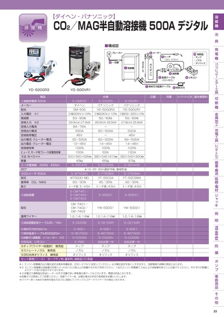 【ダイヘン・パナソニック】CO2/MAG半自動溶接機500Aデジタル■構成図日極月極セーフティサービス料基本管理料YD-500GR3YD-500VR1商品①溶接用電源500Aメーカー型式入力電圧※1周波数定格入力※2定格入力電流定格出力電流定格負荷電圧出力電流・クレーター電流出力電圧・クレーター電圧定格使用率ヒューズ、モータ用ブレーカ容量推奨値寸法:W×D×H質量②一次電源線22SQ4芯5m2CT③CO2トーチ500A型式使用率CO2/MAG長さS-DM500ダイヘンDM-500仕様S-50GR3パナソニックYD-500GR3S-50VR1パナソニックYD-500VR1三相200V±10%三相200V±10%三相200〜220V±10%50/60㎐50/60㎐50/60㎐29.0kVA27.0kW28.0kVA26.5kW27.6kVA25.8kW84/76A500A45V30〜500A12〜45V100%100Aー60〜500Aー60〜500A14〜45V100%60Aー500A45V60〜500A14〜45V100%100A300×560×595㎜380×540×810㎜380×540×800㎜49㎏S-22C40565㎏S-22C40567㎏S-22C405※10・20・30m選択可能、価格別途S-WT50MDWT5000-MD60/30%S-YT50M4YT-50CS445/35%トーチ長:3/4.5mトーチ長:4.5mS-YT50M4YT-50CSM440/35%トーチ長:4.5m④送給装置型式適用ワイヤーS-CM7401/S-CM7402/S-CM7403CM-7401/CM-7402/CM-7403S-50DG1S-50DG1YW-50DG1YW-50DG11.2、1.4、1.6㎜1.2、1.4、1.6㎜)1.2、1.4、1.6㎜⑤送給装置延長ケーブル20/15mS-CE2DMS-60E1S-WCT602S-CO2GN⑥母材万力60SQ1m⑦母材延長ケーブル60SQ20m⑧炭酸ガス調整器ノーヒーター※3⑨500Aリモコン⑩チップ(ワイヤー径選択)販売品⑩ストレートノズル販売品⑩350A用オリフィス販売品セット価格(①〜⑨)セーフティ料、基本料、消耗品(⑩)別途S-RBDチップノズルオリフィスS-CE15GRS-60E1S-WCT602S-CO2GN送給装置一体チップノズルオリフィスS-CE15GRS-60E1S-WCT602S-CO2GN送給装置一体チップノズルオリフィス※1エンジン発電機の出力電圧設定は無負荷運転時、200〜210Vに設定してください。出力電圧設定を高くしすぎますと、溶接電源の故障の原因となります。※2エンジン発電機は溶接機の定格入力(kVA)の2倍以上の容量のものをご利用ください。1台のエンジン発電機で2台以上の溶接機を使うことは避けてください。それぞれの影響によりアーク切れが起きやすくなります。※3炭酸ガス調整器は別途ヒーター付きや流量の多い準耐風仕様ゲージもございます。電源は別途となります。※炭酸ガスは現地にてご用意ください。溶接ワイヤー他、必要な場合は早めの御相談をお願いいたします。※ワイヤー径1.4㎜Φが使用可能なのはCO2溶接にてフラックスコアードワイヤーでの場合となります。23