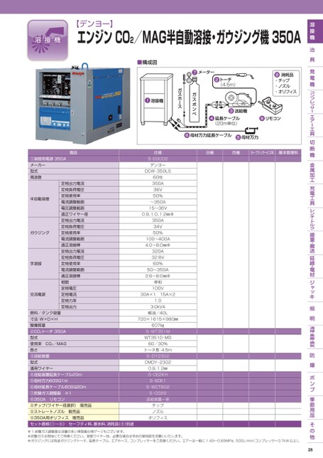 【デンヨー】エンジンCO2/MAG半自動溶接・ガウジング機350A日極月極セーフティサービス料基本管理料■構成図仕様S-EGCO2デンヨーDCW-350LS60㎐350A36V50%〜350A15〜36V0.9、1.0、1.2㎜Φ350A34V50%100〜400A4.0〜8.0㎜Φ320A32.8V60%50〜350A2.6〜8.0㎜Φ単相100V30A×115A×21.03.0kVA軽油/40L720×1615×980㎜607㎏S-WT351MWT3510-MD60/30%トーチ長:4.5mS-DY2302CMDY-23020.9、1.2㎜S-CE2KHS-60E1S-WCT602S-CO2G送給装置一体チップノズルオリフィス商品①溶接用電源350Aメーカー型式周波数半自動溶接ガウジング手溶接交流電源定格出力電流定格負荷電圧定格使用率電流調整範囲電圧調整範囲適正ワイヤー径定格出力電流定格負荷電圧定格使用率電流調整範囲適正溶接棒定格出力電流定格負荷電圧定格使用率電流調整範囲適正溶接棒相数定格電圧定格電流定格力率定格出力燃料/タンク容量寸法:W×D×H整備質量②CO2トーチ350A型式使用率CO2/MAG長さ③送給装置型式適用ワイヤー④送給装置延長ケーブル20m⑤母材万力60SQ1m⑥母材延長ケーブル60SQ20m⑦炭酸ガス調整器※1⑧350Aリモコン⑨チップ(ワイヤー径選択)販売品⑨ストレートノズル販売品⑨350A用オリフィス販売品セット価格(①〜⑧)セーフティ料、基本料、消耗品(⑨)別途※1炭酸ガス調整器は流量の多い準耐風仕様ゲージもございます。※炭酸ガスは現地にてご用意ください。溶接ワイヤー他、必要な場合は早めの御相談をお願いいたします。※ガウジングには別途ガウジングトーチ、延長ケーブル、エアホース、コンプレッサーをご用意ください。エアーは一般に1.49〜0.69MPa、500L/min(コンプレッサー3.7kW以上)。25