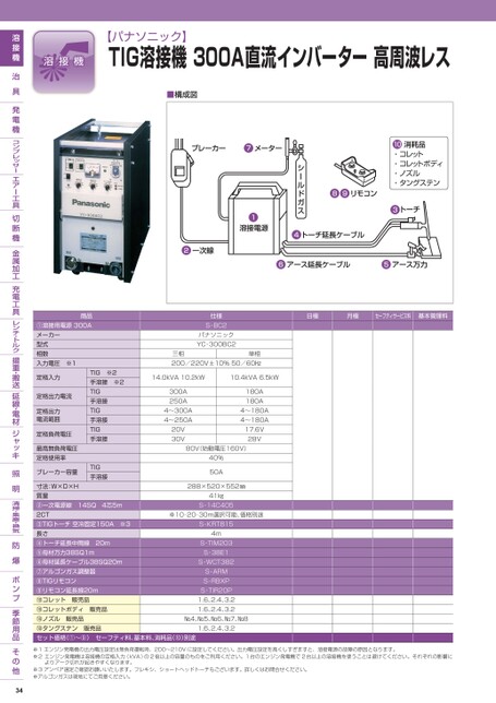 【パナソニック】TIG溶接機300A直流インバーター高周波レス■構成図日極月極セーフティサービス料基本管理料商品①溶接用電源300Aメーカー型式相数入力電圧※1定格入力定格出力電流定格出力電流範囲定格負荷電圧最高無負荷電圧定格使用率ブレーカー容量TIG※2手溶接※2TIG手溶接TIG手溶接TIG手溶接TIG手溶接仕様S-BC2パナソニックYC-300BC2三相単相200/220V±10%50/60㎐14.0kVA10.2kW10.4kVA6.5kW300A250A4〜300A4〜250A20V30V180A180A4〜180A4〜180A17.6V28V80V(始動電圧160V)40%50A288×520×552㎜※10・20・30m選択可能、価格別途寸法:W×D×H質量②一次電源線14SQ4芯5m2CT③TIGトーチ空冷固定150A※3長さ④トーチ延長中間線20m⑤母材万力38SQ1m⑥母材延長ケーブル38SQ20m⑦アルゴンガス調整器⑧TIGリモコン⑨リモコン延長線20m⑩コレット販売品⑩コレットボディ販売品⑩ノズル販売品⑩タングステン販売品セット価格(①〜⑨)セーフティ料、基本料、消耗品(⑩)別途41㎏S-14C405S-KRT8154mS-TIM203S-38E1S-WCT382S-ARMS-RBXPS-TIR20P1.6、2.4、3.21.6、2.4、3.2№4、№5、№6、№7、№81.6、2.4、3.2※1エンジン発電機の出力電圧設定は無負荷運転時、200〜210Vに設定してください。出力電圧設定を高くしすぎますと、溶接電源の故障の原因となります。※2エンジン発電機は溶接機の定格入力(kVA)の2倍以上の容量のものをご利用ください。1台のエンジン発電機で2台以上の溶接機を使うことは避けてください。それぞれの影響によりアーク切れが起きやすくなります。※3アンペア選定ご確認お願いいたします。フレキシ、ショートヘッドトーチもございます。詳しくはお問合せください。※アルゴンガスは現地にてご用意ください。34