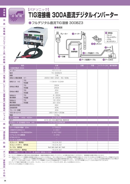 【パナソニック】TIG溶接機300A直流デジタルインバーター●フルデジタル直流TIG溶接300BZ3■構成図日極月極セーフティサービス料基本管理料仕様S-BZ3パナソニックYC-300BZ3三相200V(180〜242)50/60㎐11.5kVA10.2kW300A250A20V30V4〜300A4〜250A16〜20V20〜30V69V40%40A380×380×260㎜19.5㎏S-14C405※10・20・30m選択可能、価格別途S-KFT815※変換必要定格入力※2商品①溶接用電源300Aメーカー型式相数定格入力電圧範囲※1TIG手溶接TIG手溶接TIG手溶接TIG手溶接TIG手溶接定格出力電流定格出力電圧定格出力電流範囲定格出力電圧範囲最高無負荷電圧定格使用率ブレーカー容量寸法:W×D×H質量②一次電源線14SQ4芯5m2CT③TIGトーチ空冷固定150A※3長さ④トーチ延長中間線20m⑤母材万力38SQ1m⑥母材延長ケーブル38SQ20m⑦アルゴンガス調整器⑧TIGリモコン⑨リモコン延長線20m⑩コレット販売品⑩コレットボディ販売品⑩ノズル販売品⑩タングステン販売品セット価格(①〜⑦)セーフティ料、基本料、消耗品(⑩)別途4mS-TIM203S-38E1S-WCT382S-ARM――1.6、2.4、3.21.6、2.4、3.2№4、№5、№6、№7、№81.6、2.4、3.2※1エンジン発電機の出力電圧設定は無負荷運転時、変動許容範囲内に設定してください。出力電圧設定を高くしすぎますと、溶接電源の故障の原因となります。※2単相出力のエンジン発電機は溶接機の定格入力(kVA)の2倍以上、また三相出力のエンジン発電機は溶接機の定格入力(kVA)の3.4倍以上の容量のものでダンパ巻線付のものをご使用ください。一般のエンジン発電機は商用電源と比べて不可変動に対する電圧回復時間が遅いため、十分な容量がないとアークスタートなどによる急激な電流変化で出力電圧が低下しアーク切れを起こします。1台のエンジン発電機で2台以上の溶接機を使うことは避けてください。それぞれの影響によりアーク切れが起きやすくなります。※3アンペア選定ご確認お願いいたします。フレキシ、ショートヘッドトーチもございます。詳しくはお問合せください。※アルゴンガスは現地にてご用意ください。36