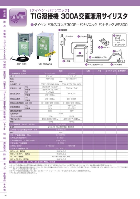 【ダイヘン・パナソニック】TIG溶接機300A交直兼用サイリスタ●ダイヘンパルスコンパ300P・パナソニックパナティグWP300■構成図AEP-300YC-300WP4商品①溶接用電源300Aメーカー型式相数入力電圧※1定格入力※2直流出力電流交流出力電流TIG手溶接TIG手溶接TIG手溶接S-AEP300ダイヘンAEP-300仕様単相S-3WP4パナソニックYC-300WP4200V±10%50/60㎐200〜220V50/60㎐28.8kVA12.9kW23.8kVA15.1kW5〜300A20〜300A20〜300A26kVA17kW5〜300A20〜300A定格出力電流範囲AC/DC10〜300/20〜300A5〜300/20〜300A日極月極セーフティサービス料基本管理料22V32V78V定格負荷電圧TIG手溶接460×663×859㎜150A161㎏最高無負荷電圧定格使用率ブレーカー容量寸法:W×D×H質量②一次電源線14SQ4芯5m2CT③TIGトーチ空冷固定150A※3長さ④トーチ延長中間線20m⑤母材万力38SQ1m⑥母材延長ケーブル38SQ20m⑦アルゴンガス調整器⑧TIGリモコン⑨リモコン延長線20m⑩コレット販売品⑩コレットボディ販売品⑩ノズル販売品⑩タングステン販売品セット価格(①〜⑨)セーフティ料、基本料、消耗品(⑩)別途S-RBXDD16〜22V20〜32V80V150A40%465×617×846㎜150㎏S-14C405※10・20・30m選択可能、価格別途S-KRT8154mS-TIM203S-38E1S-WCT382S-ARMS-TIR20D1.6、2.4、3.21.6、2.4、3.2専用付属№4、№5、№6、№7、№81.6、2.4、3.2※1エンジン発電機の出力電圧設定は無負荷運転時、200〜210Vに設定してください。出力電圧設定を高くしすぎますと、溶接電源の故障の原因となります。※2エンジン発電機は溶接機の定格入力(kVA)の2倍以上の容量のものをご利用ください。1台のエンジン発電機で2台以上の溶接機を使うことは避けてください。それぞれの影響によりアーク切れが起きやすくなります。※3アンペア選定ご確認お願いいたします。フレキシトーチ、ショートヘッドトーチもございます。詳しくはお問合せください。※アルゴンガスは現地にてご用意ください。38