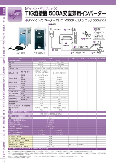 【ダイヘン・パナソニック】TIG溶接機500A交直兼用インバーター●ダイヘンインバーターエレコン500P・パナソニック500WX4■構成図AVP-500YC-500WX4日極月極セーフティサービス料基本管理料S-AVP500ダイヘンAVP-500三相仕様S-5WX4パナソニックYC-500WX4三相200/220V±10%50/60㎐200/220V±10%50/60㎐22.2kVA18.6kW/19.6kVA16.8kW21.4kVA18.3kW24.0kVA19.5kW商品①溶接用電源500Aメーカー型式相数入力電圧※1定格入力※2定格出力電流直流出力電流交流出力電流(AC波形)AC-DCハイブリット出力電流(AC波形)定格負荷電圧TIGAC/DC手溶接TIG手溶接TIGAC手溶接ハード標準ソフトハード標準ソフトTIGAC/DC手溶接DC500A400A5〜300A50〜400A20〜500A20〜500A20〜330A20〜500A20〜500A20〜330A26/24V36V80V60%100A500A400A5〜500A50〜400A20〜500A20〜500A20〜330A―――16〜26/16〜24V36V75V60%75A440×585×945㎜118㎏※10・20・30m選択可能、価格別途96㎏467×611×877㎜最高無負荷電圧定格使用率ヒューズ、モータ用ブレーカー容量推奨値寸法:W×D×H質量②一次電源線22SQ4芯5m2CT③TIGトーチ水冷固定500A※3長さ④トーチ延長中間線20m⑤水ホース20m⑥母材万力60SQ1m⑦母材延長ケーブル60SQ20m⑧アルゴンガス調整器⑨TIGリモコン⑩リモコン延長線20m⑪水冷水循環装置⑫コレット販売品⑫コレットボディ販売品⑫ノズル(メタルノズル)販売品⑫タングステン販売品⑫絶縁スリーブ販売品⑫スーパークーラント販売品セット価格(①〜⑪)セーフティ料、基本管理料、消耗品(⑫)別途S-RBXDDS-TIR20DS-STDAINS-22C405S-WRT8508mS-TIM206S-WH20S-60E1S-WCT602S-ARMS-RBXPS-TIR20PS-STMA各種各種各種各種各種メタルノズル選択時使用HSCL10※1エンジン発電機の出力電圧設定は無負荷運転時、200〜210Vに設定してください。出力電圧設定を高くしすぎますと、溶接電源の故障の原因となります。※2エンジン発電機は溶接機の定格入力(kVA)の2倍以上の容量のものをご利用ください。1台のエンジン発電機で2台以上の溶接機を使うことは避けてください。それぞれの影響によりアーク切れが起きやすくなります。※3アンペア選定のご確認をお願いいたします。225Aフレキ、300Aもございます。44ページをご確認いただき、お問い合わせください。※アルゴンガスは現地にてご用意ください。40