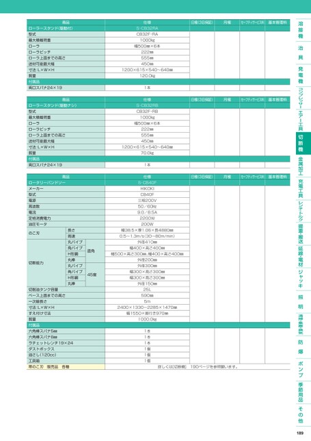 商品ローラースタンド(駆動付)型式最大積載荷重ローラローラピッチローラ上面までの高さ送材可能最大幅寸法:L×W×H質量付属品両口スパナ24×19商品ローラースタンド(駆動ナシ)型式最大積載荷重ローラローラピッチローラ上面までの高さ送材可能最大幅寸法:L×W×H質量付属品両口スパナ24×19商品ロータリーバンドソーメーカー型式電源周波数電流定格消費電力油圧モータのこ刃切断能力長さ周速丸パイプ角パイプH形鋼丸棒丸パイプ角パイプH形鋼丸棒直角45度切削油タンク容量ベース上面までの高さ一次線長さ寸法:L×W×Hすえ付け寸法質量付属品六角棒スパナ5㎜六角棒スパナ8㎜ラチェットレンチ19×24ダストボックス油さし(120cc)工具箱帯のこ刃販売品各種日極(3日保証)月極セーフティサービス料基本管理料日極(3日保証)月極セーフティサービス料基本管理料日極(3日保証)月極セーフティサービス料基本管理料仕様S-CB32RACB32F-RA1000㎏幅500㎜×6本222㎜555㎜450㎜1200×615×540〜640㎜120.0㎏1本仕様S-CB32RBCB32F-RB1000㎏幅500㎜×6本222㎜555㎜450㎜1200×615×540〜640㎜70.0㎏1本仕様S-CB40FHIKOKICB40F三相200V50/60㎐9.0/8.5A2200W200W幅38.5×厚1.06×長4880㎜0.5〜1.3m/s(30〜80m/min)外径410㎜幅400×高さ400㎜幅500×高さ300㎜、幅400×高さ400㎜外径200㎜外径300㎜幅300×高さ300㎜幅300×高さ300㎜外径150㎜25L590㎜5m2400×1330〜2285×1470㎜幅1550×奥行き970㎜1000.0㎏1本1本1本1個1個1個詳しくは[切断機]190ページを参照願います。189