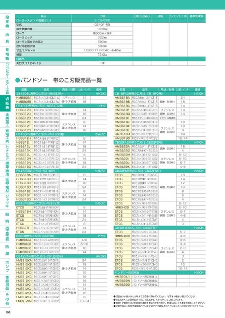 日極(3日保証)月極セーフティサービス料基本管理料商品ローラースタンド(駆動ナシ)型式最大積載荷重ローラローラピッチローラ上面までの高さ送材可能最大幅寸法:L×W×H質量付属品両口スパナ24×19仕様S-CB40RBCB40F-RB1000㎏幅600㎜×6本222㎜590㎜500㎜1200×717×540〜640㎜73.0㎏1本●バンドソー帯のこ刃販売品一覧品番品名用途/材質品番品名用途/材質190●切削油は水道水または軟水で25倍に薄めてください。地下水や硬水は避けてください。●CB22FAには切削油が15L、CB32FB、CB40Fには25L入ります。●低温下で保管すると切削油が凍結する場合があります。気温に応じて不凍液を添加してください。●記載がない山設定や廃盤等ございますのでご不明な点がございましたらお問い合わせだくさい。帯のこ刃ハイス(CB18DBL)14山帯のこ刃ハイス(CB18DBL)18山ステンレス鋼材・非鉄材鋼材・非鉄材ステンレス鋼材・非鉄材鋼材・非鉄材ステンレス鋼材・非鉄材鋼材・非鉄材ステンレス鋼材・非鉄材鋼材・非鉄材ステンレス鋼材・非鉄材ステンレス鋼材・非鉄材帯のこ刃SK14T(RB180D)帯のこ刃SK18T(RB180D)帯のこ刃SK24T(RB180D)帯のこ刃BIM8T(RB180D)帯のこ刃BIM14T(RB180D)帯のこ刃BIM18T(RB180D)帯のこ刃合金8T(RB18)帯のこ刃合金14T(RB18)帯のこ刃合金18T(RB18)帯のこ刃合金24T(RB18)帯のこ刃ハイス8T(RB18)帯のこ刃ハイス14T(RB18)帯のこ刃ハイス24T(RB18)帯のこ刃合金8T(RB120)帯のこ刃合金14T(RB120)帯のこ刃合金18T(RB120)帯のこ刃合金24T(RB120)帯のこ刃ハイス8T(RB120)帯のこ刃ハイス14T(RB120)帯のこ刃ハイス18T(RB120)帯のこ刃ハイス24T(RB120)SB18DBL用帯のこ刃(S-MBS8J用)HMBS08AHMBS08BPB180D用帯のこ刃(S-MBS12J用)HBSS12BHBSS12CHBSS12DHBSS12EHBSS12FHBSS12GRB120FV用帯のこ刃(S-RB120F用)HBSS12HHBSS12IHBSS12JHBSS12KHBSS12LHBSS12MHBSS12NHBSS12ORB18用帯のこ刃(S-RD18用)HBSS18AHBSS18BHBSS18CHBSS18DHBSS18EHBSS18FHBSS18GRB18FV用帯のこ刃(S-RB18Y用)ETCSHBSS18HETCSETCSETCSHBSS18IETCSB32F用帯のこ刃(S-B32F用)HMBS32AHMBS32BHMBS32CHMBS32DCB12VA用帯のこ刃(S-CB12V2用)HMBS12KAHMBS12KBHMBS12KCHMBS12KDHMBS12KGHMBS12KHHMBS12KIHMBS12KJHMBS12KKHMBS12KLHMBS12KM帯のこ刃合金#124T(CB12)帯のこ刃合金#218T(CB12)帯のこ刃合金#314T(CB12)帯のこ刃合金#410T(CB12)帯のこ刃合金#718T(CB12)帯のこ刃ハイス#2718TCB12)帯のこ刃ハイス#814TCB12)帯のこ刃ハイス#2814TCB12)帯のこ刃ハイス#910TCB12)帯のこ刃ハイス#108TCB12)帯のこ刃ハイス#1110-14T(CB12)帯のこ刃合金8T(RB180FV)帯のこ刃合金14T(RB180FV)帯のこ刃合金18T(RB180FV)帯のこ刃合金24T(RB180FV)帯のこ刃ハイス8T(RB180FV)帯のこ刃ハイス14T(RB180FV)帯のこ刃ハイス24T(RB180FV)帯のこ刃ハイス4/6T(32F)帯のこ刃ハイス6/10T(32F)帯のこ刃ハイス10T(32F)帯のこ刃ハイス14T(32F)ステンレス鋼材・非鉄材鋼材・非鉄材価格HIKOKIマキタやまびこやまびこやまびこアサダHIKOKI山数/インチ141814182481418814182481418248141824814248141824814244/66/101014241814101818141410810-14鋼材・非鉄材ステンレス鋼材・非鉄材鋼材・非鉄材帯のこ刃合金#124TCB18)帯のこ刃合金#218TCB18)帯のこ刃合金#314TCB18)帯のこ刃ハイス#614T(CB18)ステンレス鋼材・非鉄材帯のこ刃ハイス#2614T(CB18)帯のこ刃グリッド#8(CB18)ダグタイル鋳鉄管他帯のこ刃ハイス#918T(CB18)帯のこ刃ハイス#2918TCB18)帯のこ刃ハイス#108T(CB18)帯のこ刃ハイス#1124T(CB18)帯のこ刃ハイス#1310-14T(CB18)ステンレス鋼材・非鉄材帯のこ刃合金#118TCB22)帯のこ刃合金#74T(CB22)帯のこ刃ハイス#88-12T(CB22)帯のこ刃ハイス#96-10T(CB22)帯のこ刃ハイス#105-7T(CB22)帯のこ刃ハイス#114-6T(CB22)CB18FA3用帯のこ刃(S-CB18F3用)HMBS18AHMBS18BHMBS18CHMBS18FHMBS18GHMBS18IHMBS18JHMBS18KHMBS18LHMBS18MHMBS18OCB22FA2用帯のこ刃(S-CB22F2用)HMBS22AHMBS22GHMBS22HHMBS22IHMBS22JHMBS22KCB32FB用帯のこ刃(S-CB32FB用)ETCS帯のこ刃合金#118TCB32)ETCS帯のこ刃合金#214TCB32)ETCS帯のこ刃合金#312TCB32)ETCS帯のこ刃合金#410TCB32)ETCS帯のこ刃合金#58T(CB32)ETCS帯のこ刃合金#66T(CB32)ETCS帯のこ刃合金#74T(CB32)帯のこ刃ハイス#88-12TCB32)ETCS帯のこ刃ハイス#96-10TCB32)HMBSH32I帯のこ刃ハイス#105-7TCB32)ETCS帯のこ刃ハイス#114-6TCB32)ETCSETCS帯のこ刃ハイス#124T(CB32)ETCS帯のこ刃ハイス#133T(CB32)CB40F用帯のこ刃(S-CB40F用)帯のこ刃ハイス#15-7TCB40)ETCS帯のこ刃ハイス#24-6TCB40)HMBSH40B帯のこ刃ハイス#33-6TCB40)ETCS帯のこ刃ハイス#43-4TCB40)ETCS帯のこ刃ハイス#52-3TCB40)ETCSETCS帯のこ刃ハイス#64T(CB40)ETCS帯のこ刃ハイス#73T(CB40)ETCS帯のこ刃ハイス#82T(CB40)ETCS帯のこ刃ハイス#910T(CB40)帯のこ刃ハイス#1010-14T(CB40)ETCSバンドソー用切削油HMBSOIL1HMBS22NHMBS22Oバンドソー用切削油1Lバンドソー用切削油4Lバンドソー用不凍液4Lステンレス鋼材・非鉄材ステンレス鋼材・非鉄材鋼材・非鉄材山数/インチ価格HIKOKI2418141414181882410-141848-126-105-74-6181412108648-126-105-74-6435-74-63-63-42-34321010-14HIKOKIHIKOKIHIKOKIHIKOKI