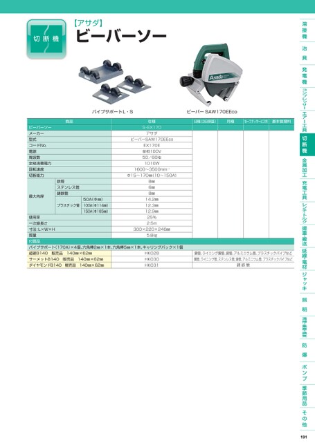 【アサダ】ビーバーソーパイプサポートL・SビーバーSAW170EEco日極(3日保証)月極セーフティサービス料基本管理料ビーバーソーメーカー型式コードNo.電源周波数定格消費電力回転速度切断能力最大肉厚商品仕様S-EX170アサダビーバーSAW170EEcoEX170E単相100V50/60㎐1010W1600〜3500min-1Φ15〜170㎜(10〜150A)鉄管ステンレス管鋳鉄管プラスチック管50A(Φ㎜)100A(Φ114㎜)150A(Φ165㎜)8㎜6㎜8㎜14.2㎜12.3㎜12.9㎜使用率一次線長さ寸法:L×W×H質量付属品パイプサポート(170A)×4個、六角棒2㎜×1本、六角棒5㎜×1本、キャリングバック×1個超硬B140販売品140㎜×62㎜サーメットB140販売品140㎜×62㎜ダイヤモンドB140販売品140㎜×62㎜HK028HK030HK031300×220×240㎜25%2.5m5.8㎏鋼管、ライニング鋼管、銅管、アルミニウム管、プラスチックパイプなど鋼管、ライニング管、ステンレス管、銅管、アルミニウム管、プラスチックパイプなど鋳鉄管191