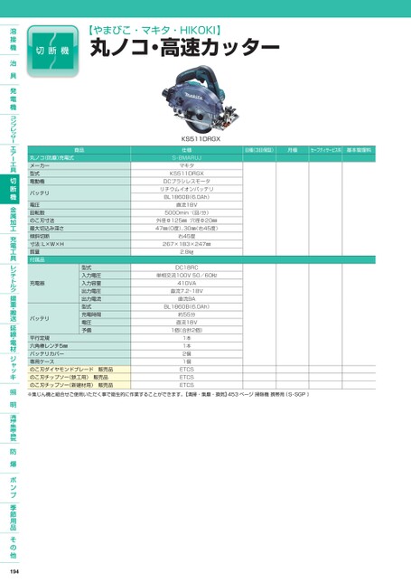 【やまびこ・マキタ・HIKOKI】丸ノコ・高速カッター日極(3日保証)月極セーフティサービス料基本管理料商品丸ノコ(防塵)充電式メーカー型式電動機バッテリ電圧回転数のこ刃寸法最大切込み深さ傾斜切断寸法:L×W×H質量付属品充電器バッテリ型式入力電圧入力容量出力電圧出力電流型式充電時間電圧予備平行定規六角棒レンチ5㎜バッテリカバー専用ケースのこ刃ダイヤモンドブレード販売品のこ刃チップソー(鉄工用)販売品のこ刃チップソー(新建材用)販売品KS511DRGX仕様S-BMARUJマキタKS511DRGXDCブラシレスモータリチウムイオンバッテリBL1860B(6.0Ah)直流18V5000min-1(回/分)外径Φ125㎜穴径Φ20㎜47㎜(0度)、30㎜(右45度)右45度267×183×247㎜2.8㎏DC18RC単相交流100V50/60㎐410VA直流7.2-18V直流9ABL1860B(6.0Ah)約55分直流18V1個(合計2個)1本1本2個1個ETCSETCSETCS※集じん機と組合せご使用いただく事で衛生的に作業することができます。【清掃・集塵・換気】453ページ掃除機携帯用(S-SGP)194