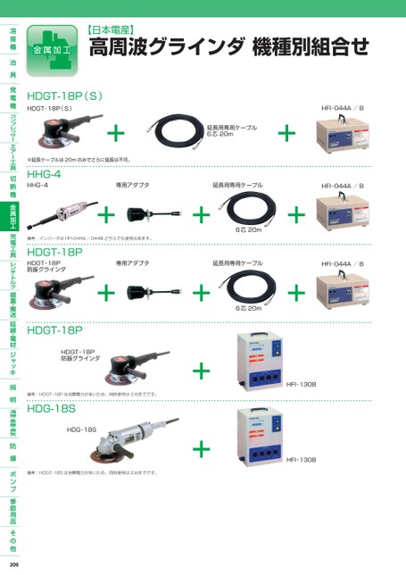 【日本電産】高周波グラインダ機種別組合せHDGT-18P(S)HDGT-18P(S)HFI-044A/B延長用専用ケーブル6芯20m※延長ケーブルは20mのみでさらに延長は不可。HHG-4HHG-4専用アダプタ延長用専用ケーブルHFI-044A/B備考:インバータはHFI-044A/044Bどちらでも使用出来ます。6芯20m専用アダプタ延長用専用ケーブルHFI-044A/B6芯20mHFI-130BHFI-130BHDGT-18PHDGT-18P防振グラインダHDGT-18PHDGT-18P防振グラインダ備考:HDGT-18Pは消費電力が多いため、同時使用は2台までです。HDG-18SHDG-18S備考:HDGT-18Sは消費電力が多いため、同時使用は2台までです。206