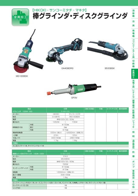 【HIKOKI・サンコーミタチ・マキタ】棒グラインダ・ディスクグラインダGA408DRG9533BSKMG100BDK商品グラインダ100Φ100メーカー型式電源最大出力研削砥石寸法外径厚さ内径無負荷回転数一次線寸法L×H質量付属品カニ目スパナ×1本、サイドハンドル×1本商品集塵カバー付きグラインダ100Φ100Vメーカー型式電源最大出力サンディングディスク外径内径GP3V仕様S-BS100HIKOKIG10BYEサンコーミタチMG100BDK単相100V50/60㎐1050W735WΦ100㎜6㎜Φ15㎜10000min-1(回転/分)12000min-1(回転/分)2.5m305×60㎜1.7㎏3.5m288×56㎜1.6㎏仕様S-BS100Sマキタ9533BSK単相100V50/60㎐720WΦ100㎜Φ15㎜日極(3日保証)月極セーフティサービス料基本管理料日極(3日保証)月極セーフティサービス料基本管理料12000min-1(回転/分)回転数長さ×胴幅質量付属品ロックナットレンチ20×1本、ホースコンプリート28-1.5×1本、バンド×1本、六角棒レンチ4×1本、ラバーパット76×1個ロックナット10-30リング301個1個308×56㎜1.6㎏207