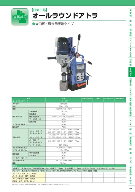 【日東工器】オールラウンドアトラ●大口径・深穴用手動タイプ商品オールラウンドアトラメーカー型式電源電気ドリル部マグネット消費電力最大板厚穴あけ能力定格消費電力定格電流無負荷回転数モールステーパ定格時間ジェットブローチワンタッチタイプジェットブローチハイブローチワンタッチタイプツイストドリルマグネット最大磁力マグネット寸法:W×L調整範囲本体前後移動本体角度日極(3日保証)月極セーフティサービス料基本管理料仕様S-JB100A日東工器ARA-100AAC200V50/60㎐1800W9A110〜210/330〜660min-1MT330分80W75㎜35L穴径:Φ17.5〜40板厚13〜35㎜50L穴径:Φ17.5〜65板厚13〜50㎜75L穴径:Φ17.5〜55板厚13〜75㎜75L穴径:Φ50.0〜100板厚13〜75㎜25L穴径:Φ17.5〜35板厚13〜25㎜最大Φ32㎜17000N(1733㎏f)110×220㎜20㎜30度5m30.0㎏283×570×623㎜キャブタイヤコード寸法:D×W×H質量付属品六角棒スパナ2.5㎜×1本、六角棒スパナ5㎜×1本、六角棒スパナ6㎜×1本、六角棒スパナ8㎜×1本、スパナ7×8×1本、ドリルドリフト×1本チェーン×1本、ホルダMT03075サイドロックAssy×1本、ホルダMT03075ワンタッチAssy×1本、工具箱×1個ジェットブローチ替刃販売品パイロットピン替刃販売品パイロットピン替刃販売品切削油替刃販売品2L入りストレートドリルをご使用の際は別途オプションが必要になりますのでお問い合わせください。209