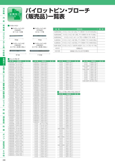 パイロットピン・ブローチ(販売品)一覧表■パイロットピン●パイロットピンD1(04025)Φ11.5〜13用●パイロットピンB1(07025)Φ14〜17用76㎜76㎜●パイロットピンA2(08035)Φ17.5〜30用(35L)●パイロットピンA3(08050)Φ17.5〜35用(50L)91㎜112㎜価格■ジェットブローチ品番HJB30ALHJB30AMHJB30APHJB30AQHJB30ARHJB30ATHJB30AVHJB30AXHJP30PBHJB30AZHJB30BCHJB30BDHJB30BEHJB30BFHJB30BGHJB30BHHJB30CHJB30CCHJB30CDHJB30CEHJB30DHJB30EHJB30EEHJB30EGHJB30FHJB30FFHJB30FHHJB30FKHJB30GHJB30GGHJB30GJHJB30GLHJB30GNHJB30HHJB30JHJB30KHJB30LHJB30MHJB30NHJB50AUHJB50AWHJB50AYHJB50AZHJB50BAHJB50BBHJB50BCHJB50BDHJB50BEHJB50BFHJB50BGHJB50BHHJB50BJHJB50CAHJB50CCHJB50CDHJB50CEHJB50CG商品名称Φ11.5×20LΦ12×20LΦ13×20LΦ13.5×25LΦ14×25LΦ15×25LΦ16×25LΦ17×25LΦ18×25LΦ17.5×35LΦ19×35LΦ19.5×35LΦ20×35LΦ20.5×35LΦ21×35LΦ21.5×35LΦ22×35LΦ22.5×35LΦ23×35LΦ23.5×35LΦ24×35LΦ24.5×35LΦ25×35LΦ26×35LΦ26.5×35LΦ27×35LΦ28×35LΦ29×35LΦ30×35LΦ31×35LΦ32×35LΦ33×35LΦ34×35LΦ35×35LΦ36×35LΦ37×35LΦ38×35LΦ39×35LΦ40×35LΦ17×50LΦ18×50LΦ19×50LΦ19.5×50LΦ20×50LΦ20.5×50LΦ21×50LΦ21.5×50LΦ22×50LΦ22.5×50LΦ23×50LΦ23.5×50LΦ24×50LΦ25×50LΦ26×50LΦ26.5×50LΦ27×50LΦ28×50L品番HJB50CJHJB50DAHJB50DCHJB50DEHJB50DGHJB50DJHJB50DLHJB50EAHJB50ECHJB50EEHJB50EGHJB50FHJB50FCHJB50FEHJB50FGHJB50FJHJB50FLHJB50GHJB50GCHJB50GEHJB50GGHJB50HHJB50HCHJB50HEHJB50HGHJB50HJHJB50JAHJB50JCHJB50JEHJB50JGHJB50JJHJB50KHJB50KCHJB50KEHJB50KGHJB50KJHJB50KLETCSETCSETCSETCSETCSETCSETCSETCSETCSETCSETCSETCSETCSETCSETCSETCSETCSETCSETCSETCSETCS商品名称Φ29×50LΦ30×50LΦ31×50LΦ32×50LΦ33×50LΦ34×50LΦ35×50LΦ36×50LΦ37×50LΦ38×50LΦ39×50LΦ40×50LΦ41×50LΦ42×50LΦ43×50LΦ44×50LΦ45×50LΦ46×50LΦ47×50LΦ48×50LΦ49×50LΦ50×50LΦ51×50LΦ52×50LΦ53×50LΦ54×50LΦ55×50LΦ56×50LΦ57×50LΦ58×50LΦ59×50LΦ60×50LΦ61×50LΦ62×50LΦ63×50LΦ64×50LΦ65×50LΦ17.5×75LΦ18×75LΦ19×75LΦ20×75LΦ21×75LΦ22×75LΦ23×75LΦ24×75LΦ25×75LΦ26×75LΦ27×75LΦ28×75LΦ29×75LΦ31×75LΦ32×75LΦ33×75LΦ34×75LΦ35×75LΦ36×75LΦ37×75LΦ38×75L218品番商品名称価格HJB30ADパイロットピンD120Lアトラ用Φ11.5-Φ13.5(20L)HJB30ABパイロットピンB125Lアトラ用Φ14-Φ17(25L)HJB30AAパイロットピンA1ハイブローチ用Φ17.5-Φ35HJB30AパイロットピンA235Lアトラ用Φ17.5-Φ40(35L)HJB50AパイロットピンA350Lアトラ用Φ17.5-Φ65(50L)HJB100Aパイロットピン12075ASSYジェットブローチ75LHSY2HSY05切削油2L切削油0.5L(CLO2725専用)価格品番ETCSETCSETCSETCSETCSETCSETCSETCSETCSETCSETCSETCSETCSETCSETCSETCSETCS商品名称Φ39×75LΦ40×75LΦ41×75LΦ42×75LΦ43×75LΦ44×75LΦ45×75LΦ46×75LΦ47×75LΦ48×75LΦ49×75LΦ50×75LΦ51×75LΦ52×75LΦ53×75LΦ54×75LΦ55×75L価格価格品番ETCSETCSHJB100EDETCSHJB100EEETCSETCSETCSETCSETCSETCSHJB100EF商品名称Φ88×75LΦ89×75LΦ90×75LΦ91×75LΦ92×75LΦ93×75LΦ94×75LΦ95×75LΦ96×75LΦ97×75LΦ98×75LΦ100×75L■ジェットブローチサイドロックタイプ価格品番ETCSETCSETCSETCSETCSETCSETCSETCSETCSETCSETCSETCSETCSETCSETCSETCSETCSETCSETCSETCSHJB100EBETCSETCSETCSETCSHJB100ECETCSETCSETCSETCSHJB100EAETCSETCSETCSETCSETCSETCSETCS商品名称Φ50×75LΦ51×75LΦ52×75LΦ53×75LΦ54×75LΦ55×75LΦ56×75LΦ57×75LΦ58×75LΦ59×75LΦ60×75LΦ61×75LΦ62×75LΦ63×75LΦ64×75LΦ65×75LΦ66×75LΦ67×75LΦ68×75LΦ69×75LΦ70×75LΦ71×75LΦ72×75LΦ73×75LΦ74×75LΦ75×75LΦ76×75LΦ77×75LΦ78×75LΦ79×75LΦ80×75LΦ81×75LΦ82×75LΦ83×75LΦ84×75LΦ85×75LΦ86×75LΦ87×75L