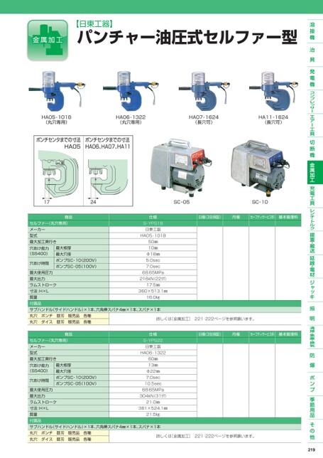 【日東工器】パンチャー油圧式セルファー型HA05-1018(丸穴専用)HA06-1322(丸穴専用)HA07-1624(長穴可)HA11-1624(長穴可)商品セルファ―(丸穴専用)メーカー型式最大加工奥行き穴あけ能力(SS400)穴あけ時間最大板厚最大穴径ポンプSC-10(200V)ポンプSC-05(100V)SC-05SC-10日極(3日保証)月極セーフティサービス料基本管理料仕様S-YPS18日東工器HA05-101850㎜10㎜Φ18㎜5.0sec7.0sec68.65MPa216kN(22tf)最大使用圧力最大出力ラムストローク寸法:H×L質量付属品サブハンドル(サイドハンドル)×1本、六角棒スパナ4㎜×1本、スパナ×1本丸穴ポンチ替刃販売品各種丸穴ダイス替刃販売品各種17.5㎜16.0㎏360×513.1㎜詳しくは〔金属加工〕221・222ページを参照願います。商品セルファ―(丸穴専用)メーカー型式最大加工奥行き穴あけ能力(SS400)穴あけ時間最大板厚最大穴径ポンプSC-10(200V)ポンプSC-05(100V)日極(3日保証)月極セーフティサービス料基本管理料仕様S-YPS22日東工器HA06-132260㎜13㎜Φ22㎜7.0sec10.5sec68.65MPa304kN(31tf)最大使用圧力最大出力ラムストローク寸法:H×L質量付属品サブハンドル(サイドハンドル)×1本、六角棒スパナ4㎜×1本、スパナ×1本丸穴ポンチ替刃販売品各種丸穴ダイス替刃販売品各種21.0㎜21.5㎏381×524.1㎜詳しくは〔金属加工〕221・222ページを参照願います。219
