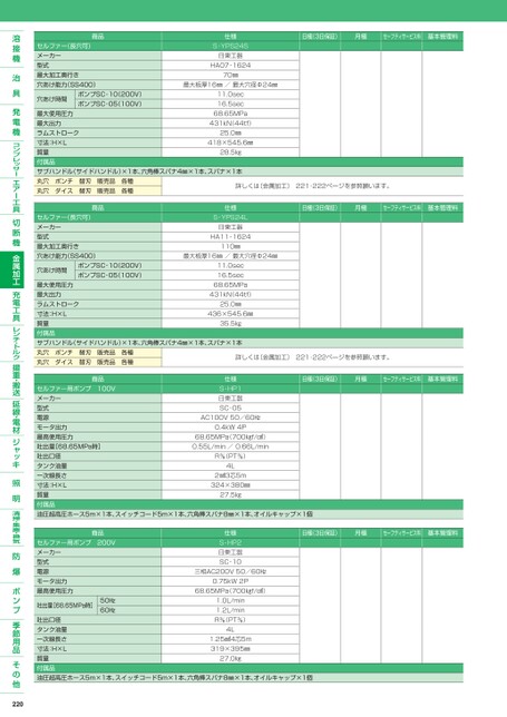 商品セルファー(長穴可)メーカー型式最大加工奥行き穴あけ能力(SS400)穴あけ時間ポンプSC-10(200V)ポンプSC-05(100V)仕様S-YPS24S日東工器HA07-162470㎜最大板厚16㎜/最大穴径Φ24㎜11.0sec16.5sec日極(3日保証)月極セーフティサービス料基本管理料68.65MPa431kN(44tf)最大使用圧力最大出力ラムストローク寸法:H×L質量付属品サブハンドル(サイドハンドル)×1本、六角棒スパナ4㎜×1本、スパナ×1本丸穴ポンチ替刃販売品各種丸穴ダイス替刃販売品各種25.0㎜28.5㎏418×545.6㎜詳しくは〔金属加工〕221・222ページを参照願います。商品セルファ―(長穴可)メーカー型式最大加工奥行き穴あけ能力(SS400)穴あけ時間ポンプSC-10(200V)ポンプSC-05(100V)仕様S-YPS24L日東工器HA11-1624110㎜最大板厚16㎜/最大穴径Φ24㎜11.0sec16.5sec日極(3日保証)月極セーフティサービス料基本管理料68.65MPa431kN(44tf)最大使用圧力最大出力ラムストローク寸法:H×L質量付属品サブハンドル(サイドハンドル)×1本、六角棒スパナ4㎜×1本、スパナ×1本丸穴ポンチ替刃販売品各種丸穴ダイス替刃販売品各種25.0㎜35.5㎏436×545.6㎜詳しくは〔金属加工〕221・222ページを参照願います。商品仕様日極(3日保証)月極セーフティサービス料基本管理料AC100V50/60㎐S-HP1日東工器SC-05セルファ―用ポンプ100Vメーカー型式電源モータ出力最高使用圧力吐出量[68.65MPa時]吐出口径タンク油量一次線長さ寸法:H×L質量付属品油圧超高圧ホース5m×1本、スイッチコード5m×1本、六角棒スパナ8㎜×1本、オイルキャップ×1個68.65MPa(700㎏f/㎠)0.55L/min/0.66L/min324×380㎜R(PT)2㎟3芯5m0.4kW4P27.5㎏4L日極(3日保証)月極セーフティサービス料基本管理料仕様S-HP2日東工器SC-10三相AC200V50/60㎐0.75kW2P68.65MPa(700㎏f/㎠)商品セルファ―用ポンプ200Vメーカー型式電源モータ出力最高使用圧力吐出量[68.65MPa時]50㎐60㎐2201.0L/min1.2L/minR(PT)吐出口径タンク油量一次線長さ寸法:H×L質量付属品油圧超高圧ホース5m×1本、スイッチコード5m×1本、六角棒スパナ8㎜×1本、オイルキャップ×1個1.25㎟4芯5m319×395㎜27.0㎏4L