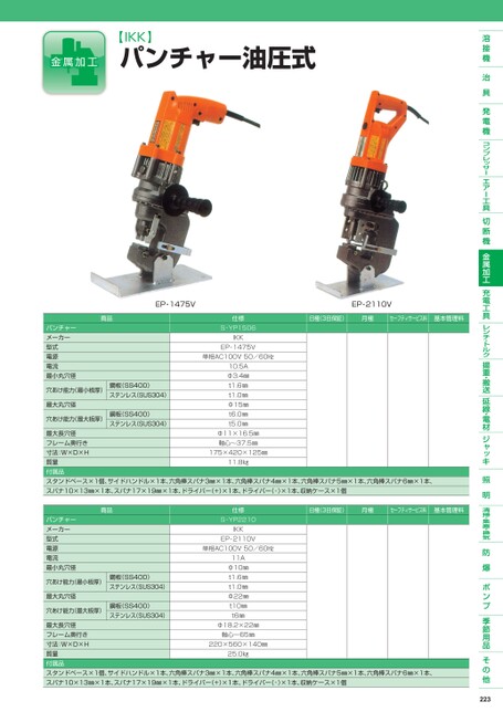 【IKK】パンチャー油圧式EP-1475VEP-2110V日極(3日保証)月極セーフティサービス料基本管理料商品パンチャーメーカー型式電源電流最小丸穴径穴あけ能力(最小板厚)最大丸穴径穴あけ能力(最大板厚)鋼板(SS400)ステンレス(SUS304)鋼板(SS400)ステンレス(SUS304)仕様S-YP1506IKKEP-1475V単相AC100V50/60㎐10.5AΦ3.4㎜t1.6㎜t1.0㎜Φ15㎜t6.0㎜t5.0㎜最大長穴径フレーム奥行き寸法:W×D×H質量付属品スタンドベース×1個、サイドハンドル×1本、六角棒スパナ3㎜×1本、六角棒スパナ4㎜×1本、六角棒スパナ5㎜×1本、六角棒スパナ6㎜×1本、スパナ10×13㎜×1本、スパナ17×19㎜×1本、ドライバー(+)×1本、ドライバー(-)×1本、収納ケース×1個Φ11×16.5㎜軸心〜37.5㎜175×420×125㎜11.8㎏日極(3日保証)月極セーフティサービス料基本管理料商品パンチャーメーカー型式電源電流最小丸穴径穴あけ能力(最小板厚)最大丸穴径穴あけ能力(最大板厚)鋼板(SS400)ステンレス(SUS304)鋼板(SS400)ステンレス(SUS304)仕様S-YP2210IKKEP-2110V単相AC100V50/60㎐11AΦ10㎜t1.6㎜t1.0㎜Φ22㎜t10㎜t6㎜Φ18.2×22㎜最大長穴径フレーム奥行き寸法:W×D×H質量付属品スタンドベース×1個、サイドハンドル×1本、六角棒スパナ3㎜×1本、六角棒スパナ4㎜×1本、六角棒スパナ5㎜×1本、六角棒スパナ6㎜×1本、スパナ10×13㎜×1本、スパナ17×19㎜×1本、ドライバー(+)×1本、ドライバー(-)×1本、収納ケース×1個220×560×140㎜軸心〜65㎜25.0㎏223