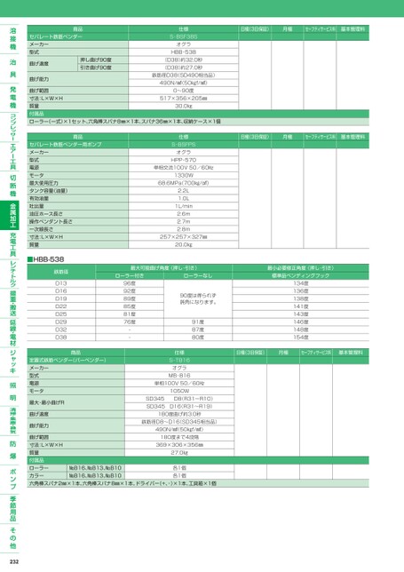商品セパレート鉄筋ベンダーメーカー型式曲げ速度曲げ能力押し曲げ90度引き曲げ90度仕様S-BSF38SオグラHBB-538(D38)約32.0秒(D38)約27.0秒鉄筋径D38(SD490相当品)490N/㎟(50㎏f/㎟)日極(3日保証)月極セーフティサービス料基本管理料曲げ範囲寸法:L×W×H質量付属品ローラー(一式)×1セット、六角棒スパナ8㎜×1本、スパナ36㎜×1本、収納ケース×1個517×356×205㎜0〜90度30.0㎏商品セパレート鉄筋ベンダー用ポンプメーカー型式電源モータ最大使用圧力タンク容量(油量)有効油量吐出量油圧ホース長さ操作ペンダント長さ一次線長さ寸法:L×W×H質量■HBB-538鉄筋径D13D16D19D22D25D29D32D38商品定置式鉄筋ベンダー(バーベンダー)メーカー型式電源モータ最大・最小曲げR曲げ速度曲げ能力日極(3日保証)月極セーフティサービス料基本管理料仕様S-BSFPSオグラHPP-570単相交流100V50/60㎐1330W68.6MPa700㎏/㎠)2.2L1.0L1L/min2.6ⅿ2.7ⅿ2.8ⅿ257×257×327㎜20.0㎏最大可能曲げ角度(押し・引き)ローラー付きローラーなし最小必要修正角度(押し・引き)標準品ベンディングフック134度136度138度141度143度146度148度154度日極(3日保証)月極セーフティサービス料基本管理料96度92度89度85度81度76度--90度は得られず鈍角になります。91度87度80度仕様S-TB16オグラMB-816単相100V50/60㎐1050WSD345D8(R31〜R10)SD345D16(R31〜R19)180度曲げ約3.0秒鉄筋径D8〜D16(SD345相当品)490N/㎟(50㎏f/㎟)180度まで4段階曲げ範囲寸法:L×W×H質量付属品ローラーカラー六角棒スパナ2㎜×1本、六角棒スパナ8㎜×1本、ドライバー(+、-)×1本、工具箱×1個№B16、№B13、№B10№B16、№B13、№B10369×306×356㎜27.0㎏各1個各1個232
