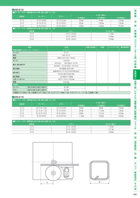 ■MB-816■ローラー・カラー標準組み合わせ表・最小必要(A)寸法鉄筋径D10D13D16ローラーB10(Φ88)B13(Φ70)B16(Φ52)カラーB10(Φ38)B13(Φ50)B16(Φ62)90度曲げ65㎜80㎜95㎜■ローラー・カラー標準組み合わせ表・最小必要(B)寸法鉄筋径D10D13D16商品定置式鉄筋ベンダー(バーベンダー)メーカー型式電源モータ最大・最小曲げR曲げ速度曲げ能力カラーB10(Φ38)B13(Φ50)B16(Φ62)仕様S-TB19オグラMB-819単相100V50/60㎐1050WSD345D8(R69〜R15)SD345D19(R59〜R19.5)180度曲げ約5.0秒鉄筋径D8〜D19(SD490相当品)620N/㎟(63㎏f/㎟)A寸法(最小)135度曲げ84㎜105㎜126㎜180度曲げ103㎜130㎜157㎜B寸法(最小)118㎜136㎜154㎜日極(3日保証)月極セーフティサービス料基本管理料曲げ範囲寸法:L×W×H質量付属品ローラーカラー六角棒スパナ2㎜×1本、六角棒スパナ17㎜×1本、スパナ17×19㎜×1本、ドライバー(+、-)×1本、工具箱×1個№B19、№B16、№B13、№B10№B19、№B16、№B13、№B10各1個各1個180度まで4段階455×372×393㎜54.5㎏■MB-819■ローラー・カラー標準組み合わせ表・最小必要(A)寸法鉄筋径D10D13D16D19ローラーB10(Φ138)B13(Φ118)B16(Φ100)B19(Φ80)カラーB10(Φ39)B13(Φ52)B16(Φ64)B19(Φ76)90度曲げ66㎜84㎜99㎜118㎜A寸法(最小)135度曲げ86㎜110㎜131㎜156㎜180度曲げ106㎜136㎜163㎜194㎜■ローラー・カラー標準組み合わせ表・最小必要(B)寸法鉄筋径D10D13D16カラーB10(Φ39)B13(Φ52)B16(Φ64)B寸法(最小)132㎜151㎜169㎜AB233