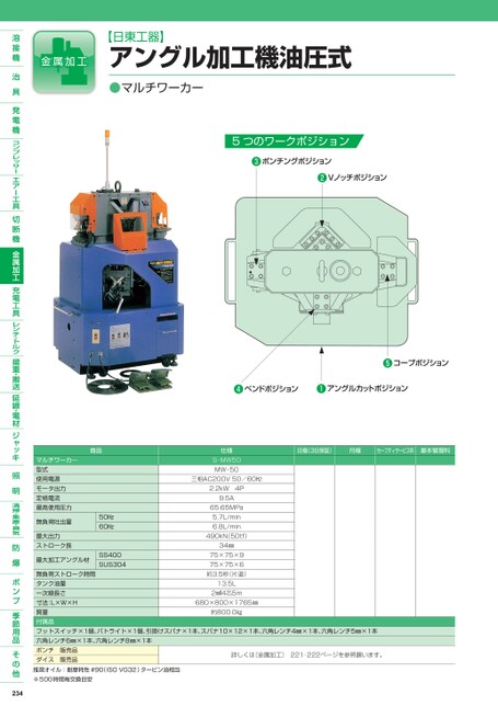【日東工器】アングル加工機油圧式●マルチワーカー5つのワークポジション日極(3日保証)月極セーフティサービス料基本管理料商品50㎐60㎐マルチワーカ―型式使用電源モータ出力定格電流最高使用圧力無負荷吐出量最大出力ストローク長最大加工アングル材SS400SUS304仕様S-MW50MW-50三相AC200V50/60㎐2.2kW4P9.5A65.65MPa5.7L/min6.8L/min490kN(50tf)34㎜75×75×975×75×6約3.5秒(片道)13.5L2㎟4芯5m無負荷ストローク時間タンク油量一次線長さ寸法:L×W×H質量付属品フットスイッチ×1個、パトライト×1個、引掛けスパナ×1本、スパナ10×12×1本、六角レンチ4㎜×1本、六角レンチ5㎜×1本六角レンチ6㎜×1本、六角レンチ8㎜×1本ポンチ販売品ダイス販売品詳しくは〔金属加工〕221・222ページを参照願います。680×800×1765㎜約800.0㎏推奨オイル:耐摩耗性#90(ISOVG32)タービン油相当※500時間毎交換目安234