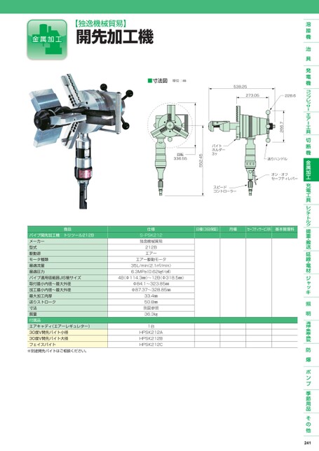 【独逸機械貿易】開先加工機■寸法図単位:㎜日極(3日保証)月極セーフティサービス料基本管理料商品パイプ開先加工機トリツール212Bメーカー型式駆動源モータ種類最適流量最適圧力パイプ適用径範囲JIS管サイズ取付最小内径〜最大外径加工最小内径〜最大外径最大加工肉厚送りストローク寸法質量付属品エアキャディ(エアーレギュレター)30度V開先バイト小径30度V開先バイト大径フェイスバイト※別途開先バイトはご相談ください。仕様S-PSK212独逸機械貿易212Bエアーエアー駆動モータ35L/min(2.1㎥/min)6.3MPa(0.62㎏f/㎠)4B(Φ114.3㎜)〜12B(Φ318.5㎜)Φ84.1〜323.85㎜Φ87.37〜328.85㎜33.4㎜50.8㎜別図参照36.3㎏1台HPSK212AHPSK212BHPSK212C241