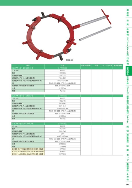 日極(3日保証)月極セーフティサービス料基本管理料商品パイプカッター20-22インチメーカー型式切断能力(鋼管)切断能力(ダグタイル管、鋳鉄管)切断能力(パイプ径)※公称(実際のO.D.㎜)刃切断材質※刃の交換で材質変更全長質量パイプカッター24-26インチメーカー型式切断能力(鋼管)切断能力(ダグタイル管、鋳鉄管)切断能力(パイプ径)※公称(実際のO.D.㎜)刃切断材質※刃の交換で材質変更全長質量パイプカッター28-34インチメーカー型式切断能力(鋼管)切断能力(ダグタイル管、鋳鉄管)切断能力(パイプ径)※公称(実際のO.D.㎜)刃切断材質※刃の交換で材質変更全長質量替刃鋼管・ダグタイル鋳鉄管用(RCI8-30)販売4個必要替刃ステンレス管用Sch.40(RCS8-36)販売4個必要替刃ステンレス管用Sch.40&80(RAX)販売4個必要RC24S仕様S-PPC550REEDRC20S20〜22"18〜20"476〜572㎜RCI8-30(鋼管・ダグタイル鋳鉄管用)鋼管、ダグタイル鋳鉄2680㎜40.5㎏S-PPC650REEDRC24S24〜26"22〜24"584〜660㎜RCI8-30(鋼管・ダグタイル鋳鉄管用)鋼管、ダグタイル鋳鉄2807㎜48.6㎏S-PPC850REEDRC30S28〜34"30"698〜864㎜RCI8-30(鋼管・ダグタイル鋳鉄管用)鋼管、ダグタイル鋳鉄2438㎜128.6㎏HPPCEHPPCFHPPCG245