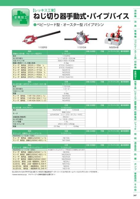 【レッキス工業】ねじ切り器手動式・パイプバイス●ベビーリード型・オースター型パイプマシン1102R31101D4NS25AⅢ日極(3日保証)月極セーフティサービス料基本管理料日極(3日保証)月極セーフティサービス料基本管理料仕様S-NK32R1102R3〜1B(8〜32A)㎜690×490×430㎜2.3㎏ETCS(154001)ETCS(154003)NE2R15NE2R20NE2R25ETCS(154010)仕様S-NK50R1101D41/2〜2ー9.9㎏NE4R20NE4R32NE4R50仕様S-NS25A3単相100V商品手動ねじ切り器ベビーリード型2R3型式ねじ切り能力寸法:H×L×W質量※専用ケース、付属工具含チェーザ販売品2R3チェーザ8Aチェーザ販売品2R3チェーザ10Aチェーザ販売品2R3チェーザ15Aチェーザ販売品2R3チェーザ20Aチェーザ販売品2R3チェーザ25A1チェーザ販売品2R3チェーザ32A1商品ねじ切り器114Rラチェット付オースター型型式ねじ切り能力寸法H×L×W質量チェーザ販売品114R15A-20A(-)チェーザ販売品114R25A-32A(1-1)チェーザ販売品114R40A-50A(1-2)商品ねじ切り器パイプマシン型式モータ主軸回転(無負荷)ねじ切り能力タンク容量寸法:H×L×W質量商品ダイヘッド自動切上ダイヘッド〜NS25AD〜(8〜10A)チェーザ販売品自動切上N20AC〜チェーザ販売品自動切上N20ACHSS〜商品ダイヘッド自動切上ダイヘッド〜1NS25AD〜1(15〜25A)チェーザ販売品自動切上N20AC〜チェーザ販売品自動切上N20ACHSS〜チェーザ販売品自動切上N20AC1チェーザ販売品自動切上N20ACHSS1ねじ切りOIL販売品上水道・一般配管用4L50W-Rねじ切りOIL販売品上水道・一般配管用16L50W-Rねじ切りOIL販売品一般配管用4L246-Rねじ切りOIL販売品一般配管用18L246-RNS25AⅢ日極(3日保証)月極セーフティサービス料基本管理料F25AⅢ出力400Wシリースモータ(ブレーキ付)55min-1〜1B(8〜25A)1.5L450×320×350㎜22.5㎏19.8㎏日極(3日保証)月極セーフティサービス料基本管理料日極(3日保証)月極セーフティサービス料基本管理料※切削サイズによりチェーザを変えての使用となります仕様S-DHD10ANE10ANE10AS仕様S-DHD12ANE20ANE20ACSNE25SANE25SASNEO4JNEO16JNEO4INEO18Iねじ切りオイルのPRTR法に基づくMSDS(製品安全データーシート)はREXホームページよりダウンロードできます。<www.rexind.co.jpマイページへの無料登録が必要です>247