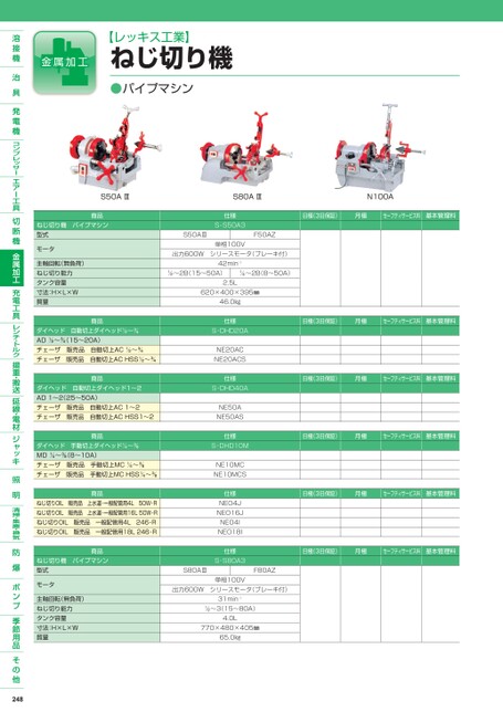 【レッキス工業】ねじ切り機●パイプマシンS50AⅢ商品ねじ切り機パイプマシン型式モータ主軸回転(無負荷)ねじ切り能力タンク容量寸法:H×L×W質量S80AⅢ仕様S-S50A3単相100VF50AZS50AⅢ出力600Wシリースモータ(ブレーキ付)42min-1〜2B(15〜50A)〜2B(8〜50A)2.5L620×400×395㎜46.0㎏N100A日極(3日保証)月極セーフティサービス料基本管理料仕様S-DHD20ANE20ACNE20ACS仕様S-DHD40ANE50ANE50AS仕様S-DHD10MNE10MCNE10MCS仕様NEO4JNEO16JNEO4INEO18I仕様S-S80A3単相100VS80AⅢ日極(3日保証)月極セーフティサービス料基本管理料日極(3日保証)月極セーフティサービス料基本管理料日極(3日保証)月極セーフティサービス料基本管理料日極(3日保証)月極セーフティサービス料基本管理料日極(3日保証)月極セーフティサービス料基本管理料F80AZ出力600Wシリースモータ(ブレーキ付)31min-1〜3(15〜80A)4.0L770×480×405㎜65.0㎏商品ダイヘッド自動切上ダイヘッド〜AD〜(15〜20A)チェーザ販売品自動切上AC〜チェーザ販売品自動切上ACHSS〜商品ダイヘッド自動切上ダイヘッド1〜2AD1〜2(25〜50A)チェーザ販売品自動切上AC1〜2チェーザ販売品自動切上ACHSS1〜2商品ダイヘッド手動切上ダイヘッド〜MD〜(8〜10A)チェーザ販売品手動切上MC〜チェーザ販売品手動切上MCHSS〜商品ねじ切りOIL販売品上水道・一般配管用4L50W-Rねじ切りOIL販売品上水道・一般配管用16L50W-Rねじ切りOIL販売品一般配管用4L246-Rねじ切りOIL販売品一般配管用18L246-R商品ねじ切り機パイプマシン型式モータ主軸回転(無負荷)ねじ切り能力タンク容量寸法:H×L×W質量248