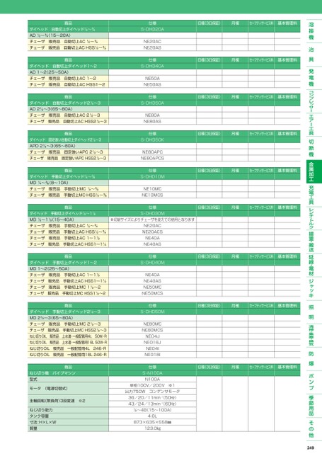 日極(3日保証)月極セーフティサービス料基本管理料日極(3日保証)月極セーフティサービス料基本管理料日極(3日保証)月極セーフティサービス料基本管理料日極(3日保証)月極セーフティサービス料基本管理料日極(3日保証)月極セーフティサービス料基本管理料日極(3日保証)月極セーフティサービス料基本管理料日極(3日保証)月極セーフティサービス料基本管理料日極(3日保証)月極セーフティサービス料基本管理料日極(3日保証)月極セーフティサービス料基本管理料商品ダイヘッド自動切上ダイヘッド〜AD〜(15〜20A)チェーザ販売品自動切上AC〜チェーザ販売品自動切上ACHSS〜商品ダイヘッド自動切上ダイヘッド1〜2AD1〜2(25〜50A)チェーザ販売品自動切上AC1〜2チェーザ販売品自動切上ACHSS1〜2商品ダイヘッド自動切上ダイヘッド2〜3AD2〜3(65〜80A)チェーザ販売品自動切上AC2〜3チェーザ販売品自動切上ACHSS2〜3商品ダイヘッド固定倣い自動切上ダイヘッド2〜3APD2〜3(65〜80A)チェーザ販売品固定倣いAPC2〜3チェーザ販売品固定倣いAPCHSS2〜3商品ダイヘッド手動切上ダイヘッド〜MD〜(8〜10A)チェーザ販売品手動切上MC〜チェーザ販売品手動切上MCHSS〜商品ダイヘッド手動切上ダイヘッド〜1MD〜1(15〜40A)チェーザ販売品手動切上AC〜チェーザ販売品手動切上ACHSS〜チェーザ販売品手動切上AC1〜1チェーザ販売品手動切上ACHSS1〜1商品ダイヘッド手動切上ダイヘッド1〜2MD1〜2(25〜50A)チェーザ販売品手動切上AC1〜1チェーザ販売品手動切上ACHSS1〜1チェーザ販売品手動切上MC1〜2チェーザ販売品手動切上MCHSS1〜2商品ダイヘッド手動切上ダイヘッド2½〜3MD2½〜3(65〜80A)チェーザ販売品手動切上MC2〜3チェーザ販売品手動切上MCHSS2〜3ねじ切りOIL販売品上水道・一般配管用4L50W-Rねじ切りOIL販売品上水道・一般配管用16L50W-Rねじ切りOIL販売品一般配管用4L246-Rねじ切りOIL販売品一般配管用18L246-R商品ねじ切り機パイプマシン型式モータ(電源切替式)主軸回転(無負荷)3段変速※2ねじ切り能力タンク容量寸法:H×L×W質量仕様S-DHD20ANE20ACNE20AS仕様S-DHD40ANE50ANE50AS仕様S-DHD50ANE80ANE80AS仕様S-DHD50KNE80APCNE80APCS仕様S-DHD10MNE10MCNE10MCS仕様S-DHD30M※切削サイズによりチェーザを変えての使用となりますNE20ACNE20ACSNE40ANE40AS仕様S-DHD40MNE40ANE40ASNE50MCNE50MCS仕様S-DHD50MNE80MCNE80MCSNEO4JNEO16JNEO4INEO18I仕様S-N100AN100A単相100V/200V※1出力750Wコンデンサモータ36/20/11min-1(50㎐)43/24/13min-1(60㎐)〜4B(15〜100A)4.0L873×635×558㎜123.0㎏249