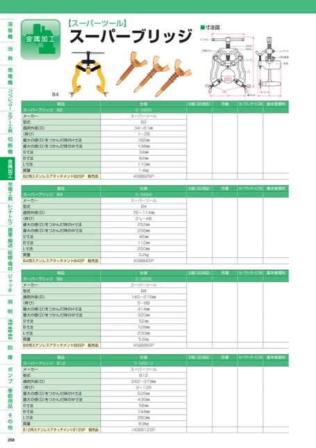 【スーパーツール】スーパーブリッジ■寸法図日極(3日保証)月極セーフティサービス料基本管理料日極(3日保証)月極セーフティサービス料基本管理料日極(3日保証)月極セーフティサービス料基本管理料日極(3日保証)月極セーフティサービス料基本管理料B4商品スーパーブリッジB2メーカー型式適用外径(D)(呼び)最大の感(D)をつかんだ時のH寸法最大の感(D)をつかんだ時のW寸法S寸法B寸法L寸法質量B2用ステンレスアタッチメントB2SP販売品商品スーパーブリッジB4メーカー型式適用外径(D)(呼び)最大の感(D)をつかんだ時のH寸法最大の感(D)をつかんだ時のW寸法S寸法B寸法L寸法質量B4用ステンレスアタッチメントB4SP販売品商品スーパーブリッジB8メーカー型式適用外径(D)(呼び)最大の感(D)をつかんだ時のH寸法最大の感(D)をつかんだ時のW寸法S寸法B寸法L寸法質量B8用ステンレスアタッチメントB8SP販売品商品スーパーブリッジB12メーカー型式適用外径(D)(呼び)最大の感(D)をつかんだ時のH寸法最大の感(D)をつかんだ時のW寸法S寸法B寸法L寸法質量B12用ステンレスアタッチメントB12SP販売品258仕様S-SBB2スーパーツールB234〜61㎜1〜2B182㎜138㎜34㎜84㎜110㎜1.4㎏HSBB2SP仕様S-SBB4スーパーツールB476〜114㎜2〜4B252㎜206㎜46㎜112㎜200㎜3.2㎏HSBB4SP仕様S-SBB8スーパーツールB8140〜216㎜5〜8B414㎜320㎜52㎜128㎜230㎜5.6㎏HSBB8SP仕様S-SBB12スーパーツールB12242〜319㎜9〜12B526㎜436㎜58㎜144㎜260㎜8.8㎏HSBB12SP
