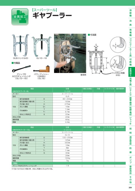 【スーパーツール】ギヤプーラーGL8(ハンドル付)GL10〜18■付属品グリップ付片口ラチェットレンチ(GL10〜18)パワープッシャー(SW8N)(GL18)使用例■寸法図T1HTD1tSD日極(3日保証)月極セーフティサービス料基本管理料日極(3日保証)月極セーフティサービス料基本管理料商品2本爪ギヤプーラ―8Lメーカー型式寸法被引抜物直径被引抜物幅D最大時爪の届く長さボルト溝幅爪先端厚みおねじ六角対辺おねじ外径破断荷重質量商品2本爪ギヤプーラ―10Lメーカー型式寸法被引抜物直径被引抜物幅D最大時爪の届く長さボルト溝幅爪先端厚みおねじ六角対辺おねじ外径破断荷重質量付属品グリップ付片口ラチェットレンチDtHD1TT1SDtHD1TT1S※寸法Hは寸法Dが最小時、おねじを最大に引上げた寸法。仕様S-2G8スーパーツールGL880〜200㎜100㎜275㎜16㎜7.4㎜6.7㎜22㎜22㎜80㎏4.4㎏仕様S-2G10スーパーツールGL10100〜250㎜125㎜300㎜18㎜8㎜7.4㎜30㎜28㎜100㎏7㎏1本259