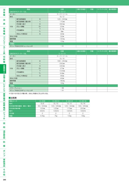 日極(3日保証)月極セーフティサービス料基本管理料日極(3日保証)月極セーフティサービス料基本管理料商品2本爪ギヤプーラ―12Lメーカー型式寸法被引抜物直径被引抜物幅D最大時爪の届く長さボルト溝幅爪先端厚みおねじ六角対辺おねじ外径破断荷重質量付属品グリップ付片口ラチェットレンチ商品2本爪ギヤプーラ―18Lメーカー型式寸法被引抜物直径被引抜物幅D最大時爪の届く長さボルト溝幅爪先端厚みおねじ六角対辺おねじ外径破断荷重質量付属品パワープッシャーグリップ付片口ラチェットレンチDtHD1TT1SDtHD1TT1S仕様S-2G12スーパーツールGL12120〜300㎜170㎜350㎜20㎜8.7㎜8㎜32㎜32㎜120㎏10㎏1本仕様S-2G18スーパーツールGL18180〜450㎜200㎜440㎜27㎜10.8㎜9.8㎜46㎜44㎜180㎏16㎏1個1本※寸法Hは寸法Dが最小時、おねじを最大に引上げた寸法。■比較表商品コード型式引き抜き物の直径最小/最大引き抜き物の幅能力爪の数質量S-2G8GL8S-2G10GL10S-2G12GL12S-2G18GL1880/200㎜100/250㎜120/300㎜180/450㎜100㎜80kN24.4㎏125㎜100kN27㎏170㎜120kN210㎏200㎜180kN216㎏260