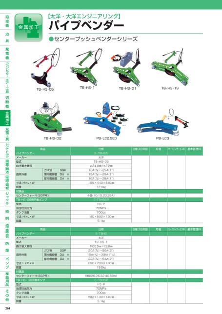 【太洋・大洋エンジニアリング】パイプベンダー●センタープッシュベンダーシリーズTB-HS-05TB-HS-1TB-HS-D1TB-HS-1STB-HS-D2PB-LC2.5EDPB-LC3日極(3日保証)月極セーフティサービス料基本管理料日極(3日保証)月極セーフティサービス料基本管理料パイプベンダーメーカー型式曲げ最大管径適用外径商品ガス管SGP薄肉電線管DU※厚肉電線管DA※寸法:H×L×W質量付属品センターフォーマ(SGP用)TB-HS-05用手動ポンプ型式油圧吐出圧力タンク油量寸法:H×L×W質量商品パイプベンダーメーカー型式曲げ最大管径適用外径ガス管SGP薄肉電線管DU※厚肉電線管DA※寸法:L×D×H質量付属品センターフォーマ(SGP用)TB-HS-1用手動ポンプ型式油圧吐出圧力タンク油量寸法:H×L×W質量264仕様S-TBHS5太洋TB-HS-05Φ34.0㎜×t3.2㎜10A()〜25A(1”)15A()〜25A(1”)16A()〜28A(1”)105×440×480㎜12.0㎏4個(10,15,20,25A)S-TBHS5PHS-P70MPa700cc140×592×130㎜5.1㎏仕様S-TBHS太洋TB-HS-1Φ60.5㎜×t3.8㎜20A()〜50A(2”)19A()〜39A(1”)22A()〜54A(2”)650×700×130㎜19.0㎏5個(20,25,32,40,50A)S-TBHSPHS-P70MPa700cc592×130×140㎜5.1㎏