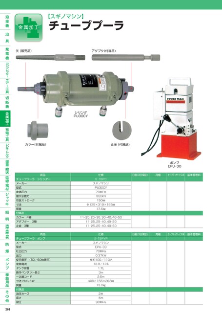 【スギノマシン】チューブプーラ矢(販売品)アダプタ(付属品)シリンダPU30CYカラー(付属品)止金(付属品)商品チューブプーラシリンダーメーカー型式定格圧力最大引抜力引抜ストローク寸法質量付属品カラー4種アダプター3種止金3種商品チューブプーラポンプメーカー型式吐出圧力出力使用電圧(50/60㎐兼用)定格電流タンク容量操作ペンダント長さ一次線コード寸法:H×L×W質量付属品油圧ホース長さ耐圧268仕様S-TBPCスギノマシンPU30CY70MPa300kN150㎜Φ135×319×185㎜17.5㎏11-25、25-30、30-40、40-5011-25、25-40、40-5011-25、25-40、40-50仕様S-TBPYPスギノマシンEPU-3070MPa0.37kW単相100/110V13.8/12A1.7L3m2.5m406×156×203㎜13.0㎏2本5m90MPaポンプEPU-30日極(3日保証)月極セーフティサービス料基本管理料日極(3日保証)月極セーフティサービス料基本管理料