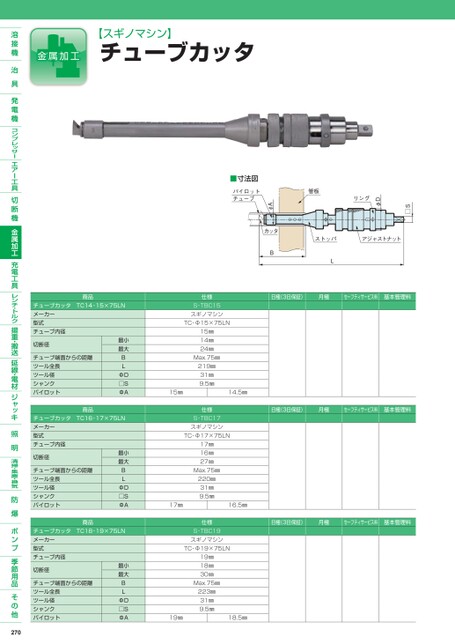 【スギノマシン】チューブカッタ■寸法図仕様S-TBC15スギノマシンTC-Φ15×75LN15㎜14㎜24㎜Max.75㎜219㎜31㎜9.5㎜15㎜14.5㎜仕様S-TBC17スギノマシンTC-Φ17×75LN17㎜16㎜27㎜Max.75㎜220㎜31㎜9.5㎜17㎜16.5㎜仕様S-TBC19スギノマシンTC-Φ19×75LN19㎜18㎜30㎜Max.75㎜223㎜31㎜9.5㎜19㎜18.5㎜商品チューブカッタTC14-15×75LNメーカー型式チューブ内径切断径チューブ端面からの距離ツール全長ツール径シャンクパイロット最小最大BLΦD□SΦA商品チューブカッタTC16-17×75LNメーカー型式チューブ内径切断径チューブ端面からの距離ツール全長ツール径シャンクパイロット最小最大BLΦD□SΦA商品チューブカッタTC18-19×75LNメーカー型式チューブ内径切断径チューブ端面からの距離ツール全長ツール径シャンクパイロット最小最大BLΦD□SΦA270日極(3日保証)月極セーフティサービス料基本管理料日極(3日保証)月極セーフティサービス料基本管理料日極(3日保証)月極セーフティサービス料基本管理料