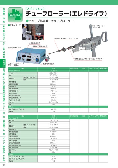 【スギノマシン】チューブローラー(エレドライブ)●チューブ拡管機チューブローラー■使用イメージチューブローラーTR-506L変速切替スイッチ拡管電流値表示拡管完了電流値表示(販売品)チューブ・エキスパンダ(標準付属品)マンドレルカップリング日極(3日保証)月極セーフティサービス料基本管理料日極(3日保証)月極セーフティサービス料基本管理料コントロールボックスTRC-1022A商品チューブローラーメーカー型式拡管能力鋼管・ステンレス管銅管無負荷電流無負荷回転速度全負荷電流全負荷回転速度全負荷回転トルク最大不可電流最大負荷回転速度最大負荷回転トルクスピンドルサイズ寸法:H×L質量付属品マンドレルカップリング格納箱商品チューブローラーメーカー型式拡管能力鋼管・ステンレス管銅管無負荷電流無負荷回転速度全負荷電流全負荷回転速度全負荷回転トルク最大不可電流最大負荷回転速度最大負荷回転トルクスピンドルサイズ寸法:H×L質量付属品マンドレルカップリングマンドレルカップリング格納箱272変速電流値表示仕様S-TBR2スギノマシンTR-502LΦ10〜19㎜Φ10〜25㎜2.3A600min-15.0A285min-17.5N・ⅿ5.7A270min-18.7N・ⅿ□9.5㎜240×425㎜5.8㎏MC-331個仕様S-TBR4スギノマシンTR-504LΦ16〜25㎜Φ19〜38㎜2.8A410min-18.0A240min-115.5N・ⅿ9.0A230min-118.0N・ⅿ□12.7㎜450×470㎜8.5㎏MC-43MC-441個