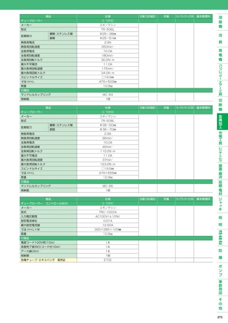 日極(3日保証)月極セーフティサービス料基本管理料日極(3日保証)月極セーフティサービス料基本管理料日極(3日保証)月極セーフティサービス料基本管理料チューブローラーメーカー型式拡管能力商品鋼管・ステンレス管銅管無負荷電流無負荷回転速度全負荷電流全負荷回転速度全負荷回転トルク最大不可電流最大負荷回転速度最大負荷回転トルクスピンドルサイズ寸法:H×L質量付属品マンドレルカップリング格納箱商品チューブローラーメーカー型式拡管能力鋼管・ステンレス管銅管無負荷電流無負荷回転速度全負荷電流全負荷回転速度全負荷回転トルク最大不可電流最大負荷回転速度最大負荷回転トルクスピンドルサイズ寸法:H×L質量付属品マンドレルカップリング格納箱商品チューブローラーコントロールBOXメーカー型式入力電圧範囲設定電流単位最大設定電流値寸法:H×L×W質量付属品電源コード100V用(10m)各管完了表示灯(コード付10m)アース線(2m)格納箱各種チューブ・エキスパンダ販売品仕様S-TBR6スギノマシンTR-506LΦ25〜38㎜Φ25〜51㎜2.9A350min-110.0A180min-130.0N・ⅿ11.0A175min-134.0N・ⅿ□19.0㎜470×500㎜10.0㎏MC-641個仕様S-TBR8スギノマシンTR-508LΦ38〜50㎜Φ38〜70㎜2.9A90min-110.0A40min-1110.0N・ⅿ11.0A37min-1123.0N・ⅿ□19.0㎜470×555㎜12.0㎏MC-661個仕様S-TBRCスギノマシンTRC-1022AAC100V(±10%)0.01A12.00A300×285×120㎜10.0㎏1本1本1本1個ETCE273