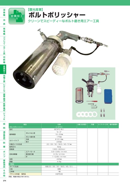 【豊光産業】ボルトポリッシャークリーンでスピーディーなボルト磨き用エアー工具日極(3日保証)月極セーフティサービス料基本管理料商品ボルトポリッシャー型式適用範囲カバーパイプ付属ガイドの孔径給気圧力回転数空気消費量ボルトねじ径ボルト磨き長外径長さエアーモータ真空吸引機計全長質量付属品ガイド(孔径)工具工具箱ブラシ(4本組)販売品研磨、飛塵の発生がありません274仕様S-BP50BESPO-特Ⅰ〜2"16〜50㎜175㎜Φ101.6㎜245㎜22/26/32/38.5/45/51㎜6atg1300〜900min-10.9〜0.6N/m3/min0.1N/m3/min1〜0.6N/m3/min445㎜4.4㎏6個(22/26/32/38.5/45/51)各種1個HBP50B