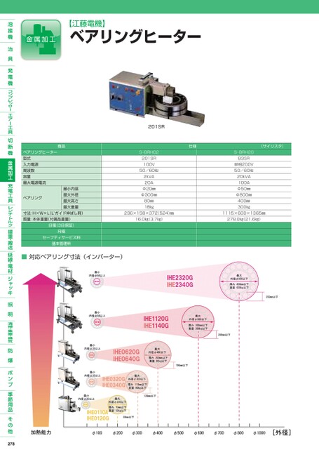 【江藤電機】ベアリングヒーター201SR商品仕様(サイリスタ)ベアリングヒーター型式入力電源周波数容量最大電源電流ベアリング最小内径最大外径最大高さ最大重量S-BRH02201SR100V50/60㎐2kVA20AΦ20㎜Φ300㎜80㎜18㎏S-BRH20B3SR単相200V50/60㎐20kVA100AΦ50㎜Φ800㎜400㎜300㎏寸法:H×W×L(Lʻガイド伸ばし時)質量:本体重量(付属品重量)236×158×372(524)㎜16.0㎏(3.7㎏)1115×600×1365㎜278.0㎏(21.6㎏)日極(3日保証)月極セーフティサービス料基本管理料■対応ベアリング寸法(インバーター)278