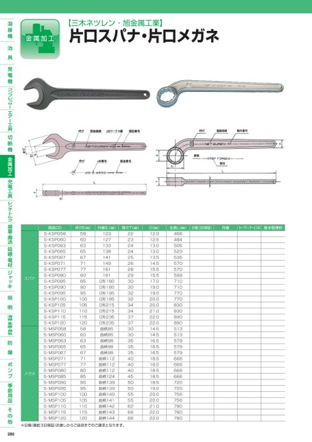 【三木ネツレン・旭金属工業】片口スパナ・片口メガネスパナメガネ商品CDS-KSP058S-KSP060S-KSP063S-KSP065S-KSP067S-KSP071S-KSP077S-KSP080S-KSP085S-KSP090S-KSP095S-KSP100S-KSP105S-KSP110S-KSP115S-KSP120S-MSP058S-MSP060S-MSP063S-MSP065S-MSP067S-MSP071S-MSP077S-MSP080S-MSP085S-MSP090S-MSP095S-MSP100S-MSP105S-MSP110S-MSP115S-MSP120呼びS(㎜)外幅S₁㎜)厚さT(㎜)58606365677177808590951001051101151205860636567717780859095100105110115120123127133138141149161161O形180O形180O形195O形195O形215O形215O形235O形235曲柄85曲柄85曲柄98曲柄98曲柄98曲柄112曲柄112曲柄112曲柄124曲柄139曲柄139曲柄140曲柄141曲柄142曲柄143曲柄1442223242425262829303032323434373730303535354040404550505555626666O(㎜)12.012.513.013.013.514.515.515.517.019.019.020.020.021.022.022.014.514.516.516.516.518.518.518.518.518.519.020.020.021.022.022.0※日極(最低3日保証)お渡しからご返却までのご請求となります。280全長L(㎜)日極(3日保証)月極セーフティサービス料基本管理料466484506523535570570599710710770770830830890890513513579579579666666666666720720756756780780780
