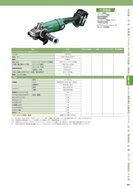 付属機能・ブレーキ機能・オートモード機能・過負荷保護機能・温度保護機能・キックバック軽減システム・再起動防止機能・ソフトスタート・2アクショントリガスイッチ・防じん・防滴構造日極(3日保証)月極セーフティサービス料基本管理料仕様S-JG180JHIKOKIG3618DA(2WP)充電式180×3.1〜3.7×22㎜180×6×22㎜2300min-¹5300min-¹531×80㎜4.7㎏UC18YDL単相交流100V50/60㎐約40分※2BSL36B181個(合計2個)1本1セット1本1本1本1本2個2本1個各種サイズ問い合わせ商品ディスクグラインダー充電式180∅メーカー型式※1電源砥石寸法(外径×最大厚さ×穴径)レジノイドフレキシブル砥石レジノイド砥石オートモード時全速モード時無負荷回転数寸法:L全長×Hギアカバー全高砥石含まず質量バッテリ含む付属品型式入力充電完了型式予備本体へ装着充電器バッテリ防振型サイドハンドルツールレスホイルカバーホイルワッシャNホイルナットカニ目スパナ六角棒スパナバッテリカバースパナ13㎜専用ケースアタッチメント砥石販売※1統一型式:G3618DA。(2WP)とはバッテリ2個、充電機1個、収納ケース1個付属時の型式です。(NN)は本体のみです。※2充電時間は周囲温度やバッテリの状態により変動致します(充電環境温度10〜40℃)※3消耗品によってはホイルカバー、ホイルワッシャ、ホイルナットが適合しない物もあり、別途交換が必要な場合がございます。※使用する砥石は、最高使用周速度72m/s{4,300m/min}以上の正規の砥石を取付け、正しい使用面で研削してください。283