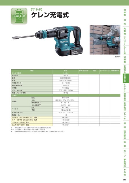 【マキタ】ケレン充電式ケレン充電式メーカー型式電源打撃エネルギー振動3軸合成値打撃数寸法:L×H×W質量バッテリ含む付属品充電器バッテリ商品型式入力実用充電完了フル充電完了型式予備チゼルシャンク専用ケーススケーリングチゼル38×200販売スケーリングチゼル50×215販売ブルポイント250販売ブルポイント380販売仕様S-KEJマキタHK180DRGX充電式(直流18V)3.1/3.9J4.5m/s0-3200368×92×211㎜3.4㎏DC18RF単相交流100V50/60㎐約17分※1約22分※2BL18301個(合計2個)SDSプラスシャンク1個HKEM01HKEM02HKEM03HKEM04※1実用充電完了:フル充電完了の約80%の充電が完了した状況※2フル充電完了:電池の容量一杯まで充電された状態※充電時間は周囲温度やバッテリの状態により変動致します(充電環境温度10〜40℃)使用例日極(3日保証)月極セーフティサービス料基本管理料285
