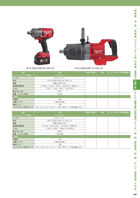 M18ONEFHIWF34-0X0JPM18ONEFHIWF1D-0C0JP日極(3日保証)月極セーフティサービス料基本管理料日極(3日保証)月極セーフティサービス料基本管理料商品インパクトレンチ充電式メーカー型式電源回転数(無負荷)トルク最大ボルト径質量バッテリ含む付属品充電器予備バッテリ専用ケースインパクトレンチ用ソケット商品インパクトレンチ充電式メーカー型式電源回転数(無負荷)トルク最大ボルト径質量バッテリ含む付属品充電器予備バッテリ専用ケースインパクトレンチ用ソケット仕様S-INPM19ミルウォーキーM18ONEFHIWF34-0X0JP充電式(直流18V)0-800/1300/1800/1800min-1(回転/分)702/1138/1627/1627NmM333.5㎏1個1個(合計2個)1個詳しくは〔レンチ・トルク〕349・350ページを参照願います。仕様S-INPM25ミルウォーキーM18ONEFHIWF1D-0C0JP充電式(直流18V)0-600/700/900/1200min-1(回転/分)1180/1254/1966/2576NmM4810.64㎏1個1個(合計2個)1個詳しくは〔レンチ・トルク〕349・350ページを参照願います。289