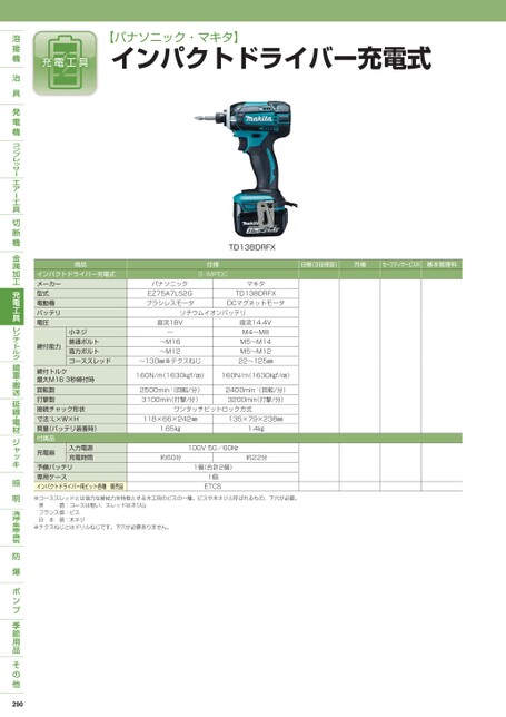 【パナソニック・マキタ】インパクトドライバー充電式日極(3日保証)月極セーフティサービス料基本管理料商品インパクトドライバー充電式メーカー型式電動機バッテリ電圧締付能力小ネジ普通ボルト高力ボルトコーススレッド締付トルク最大M163秒締付時回転数打撃数接続チャック形状寸法:L×W×H質量(バッテリ装着時)付属品充電器入力電源充電時間予備バッテリ専用ケースインパクトドライバー用ビット各種販売品TD138DRFX仕様S-IMPDCパナソニックEZ75A7LS2GブラシレスモータマキタTD138DRFXDCマグネットモータリチウムイオンバッテリ直流18V―〜M16〜M12〜130㎜※テクスねじ直流14.4VM4〜M8M5〜M14M5〜M1222〜125㎜160N/m(1630㎏f/㎝)160N/m(1630㎏f/㎝)2500min-1(回転/分)3100min(打撃/分)2400min-1(回転/分)3200min(打撃/分)ワンタッチビットロック方式118×66×242㎜135×79×238㎜1.65㎏約60分1.4㎏約22分100V50/60㎐1個(合計2個)1個ETCS※コーススレッドとは強力な締結力を特徴とする木工用のビスの一種。ビスや木ネジと呼ばれるもの、下穴が必要。英語:コースは粗い、スレッドはネジ山フランス語:ビス日本語:木ネジ※テクスねじとはドリルねじです。下穴が必要ありません。290