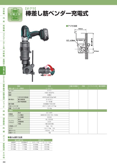 【オグラ】棒差し筋ベンダー充電式■アゴ寸法図日極(3日保証)月極セーフティサービス料基本管理料商品棒差し筋ベンダー充電式メーカー型式電源曲げ能力(SD345)相当品最大鉄筋径曲げ角度範囲曲げ速度寸法:L×H×W質量バッテリ含付属品型式入力電圧入力容量型式充電時間予備充電器(マキタ)バッテリ(マキタ)六角棒レンチスパナ油圧オイル収納ケース■最小必要寸法表最小必要寸法仕様S-HB16JオグラHBB-90DFN充電式490N/㎟(50㎏f/㎟)D16(⅝”)0〜90度90度曲げ約8.5秒457×126×277㎜10.4㎏DC18RF単相交流100V50/60㎐330WBL1830B22分1個(合計2個)5㎜1本14×17㎜1本150mL1本1個参考寸法鉄筋径D10㎜D13㎜D16㎜90度曲げカラー寸法ローラー寸法108㎜110㎜113㎜Φ38㎜Φ38㎜Φ38㎜Φ24㎜Φ24㎜Φ24㎜292