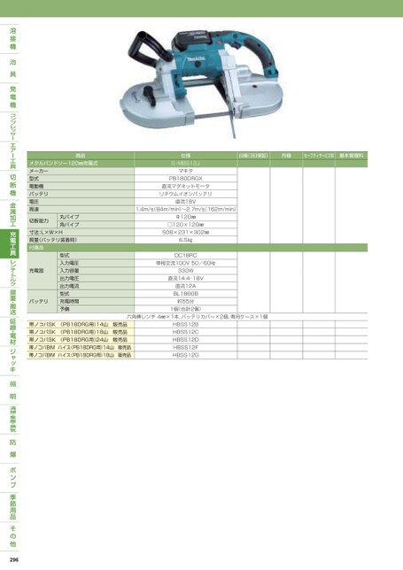 日極(3日保証)月極セーフティサービス料基本管理料商品メタルバンドソー120㎜充電式メーカー型式電動機バッテリ電圧周速切断能力丸パイプ角パイプ寸法:L×W×H質量(バッテリ装着時)付属品充電器バッテリ型式入力電圧入力容量出力電圧出力電流型式充電時間予備仕様S-MBS12JマキタPB180DRGX直流マグネットモータリチウムイオンバッテリ直流18V1.4m/s(84m/min)〜2.7m/s(162m/min)Φ120㎜□120×120㎜508×231×302㎜6.5㎏DC18RC単相交流100V50/60㎐330W直流14.4-18V直流12ABL1860B約55分1個(合計2個)六角棒レンチ4㎜×1本、バッテリカバー×2個、専用ケース×1個帯ノコバSK(PB18DRG用)14山販売品帯ノコバSK(PB18DRG用)18山販売品帯ノコバSK(PB18DRG用)24山販売品帯ノコバBIMハイス(PB18DRG用)14山販売品帯ノコバBIMハイス(PB18DRG用)18山販売品HBSS12BHBSS12CHBSS12DHBSS12FHBSS12G296